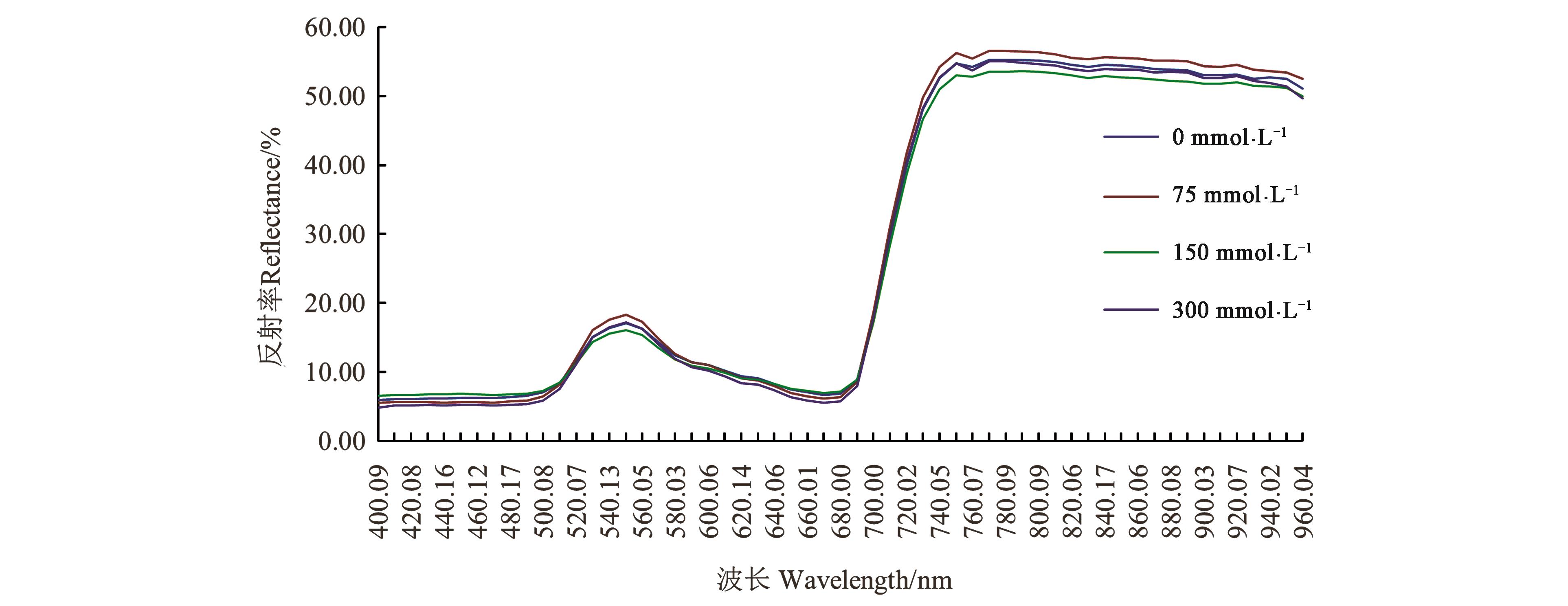 为研究不同盐胁迫对樱桃砧木幼苗叶片光合作用的影响及反射光谱的变化,以樱桃砧木大青叶为试验材料,设置0、75、150和300 mmol·L-1 NaCl盐胁迫处理,采用分光光度计、CI-340-便携式光合测定仪和CI-710光纤光谱仪测定叶绿素含量、光合及光谱,研究盐胁迫下樱桃砧木幼苗叶片色素含量、光合指标、反射光谱变化及彼此间的关系。结果表明,随着盐含量的增加,叶片净光合速率(Pn)、蒸腾速率(Tr)、气孔导度(Gs)和胞间CO2浓度(Ci)均呈先上升后下降的趋势。叶绿素a+b含量随盐浓度增加呈先升高后降低的变化趋势;其中,叶绿素a含量随着盐浓度增加先升高后降低,叶绿素b含量随着盐浓度增加逐渐降低;在75 mmol·L-1盐处理下3种叶绿体色素含量达到最高。随着盐含量的改变,樱桃砧木的光谱反射率在不同波段下的变化规律不同,但光谱特征曲线趋势一致,均有1个“绿峰”、1个“红谷”和1个反射平台。在近红外光区和绿光区波段内,反射率在75 mmol·L-1盐处理时最高,在150 mmol·L-1盐处理下最低;而在蓝紫光区和可见红光区波段内,反射率在150 mmol·L-1盐处理下最高。综上所述,适当的低盐处理对樱桃砧木大青叶的光合色素及光合作用均有一定的促进作用,光谱反射率在一定程度上反应了植株受盐胁迫的损伤程度。