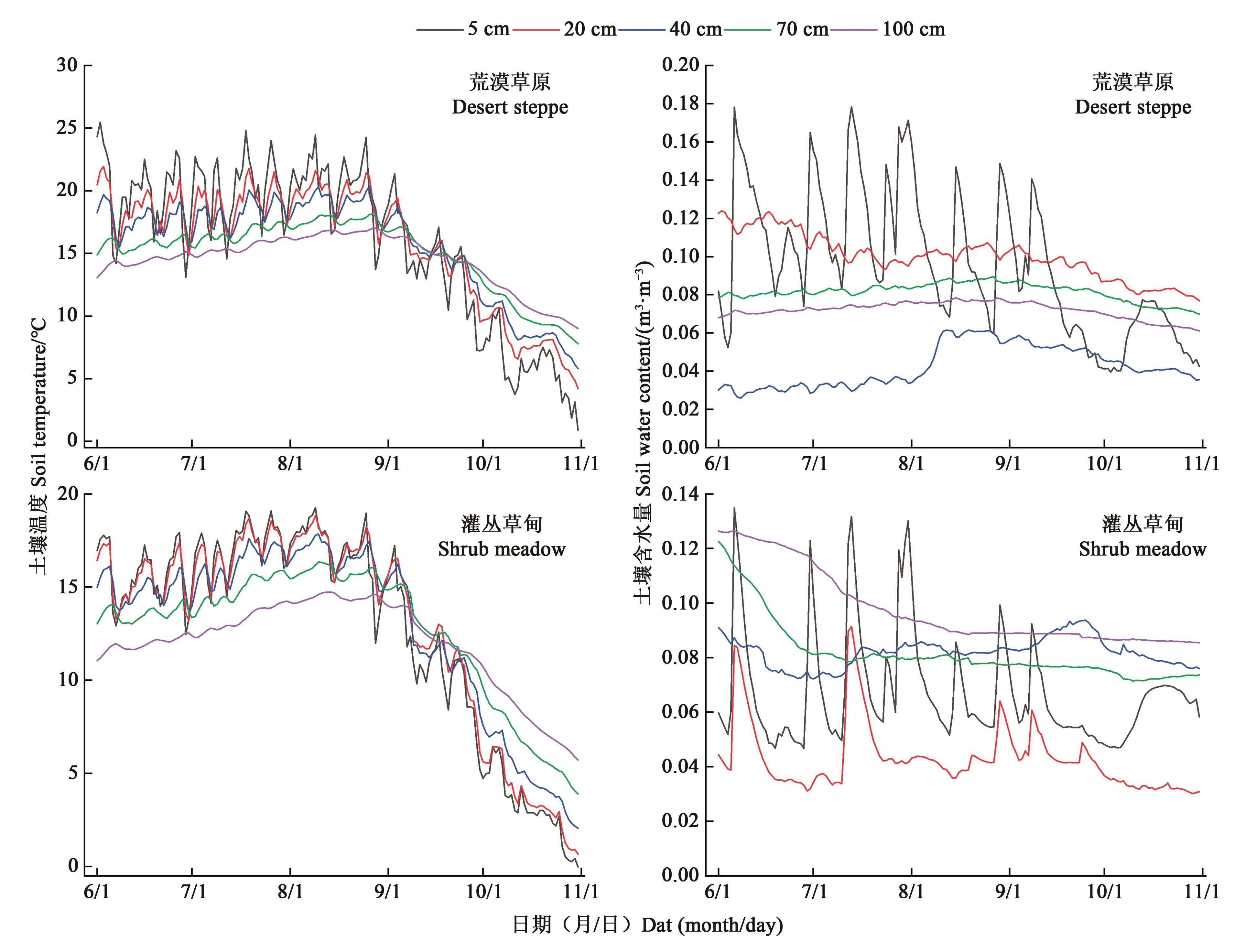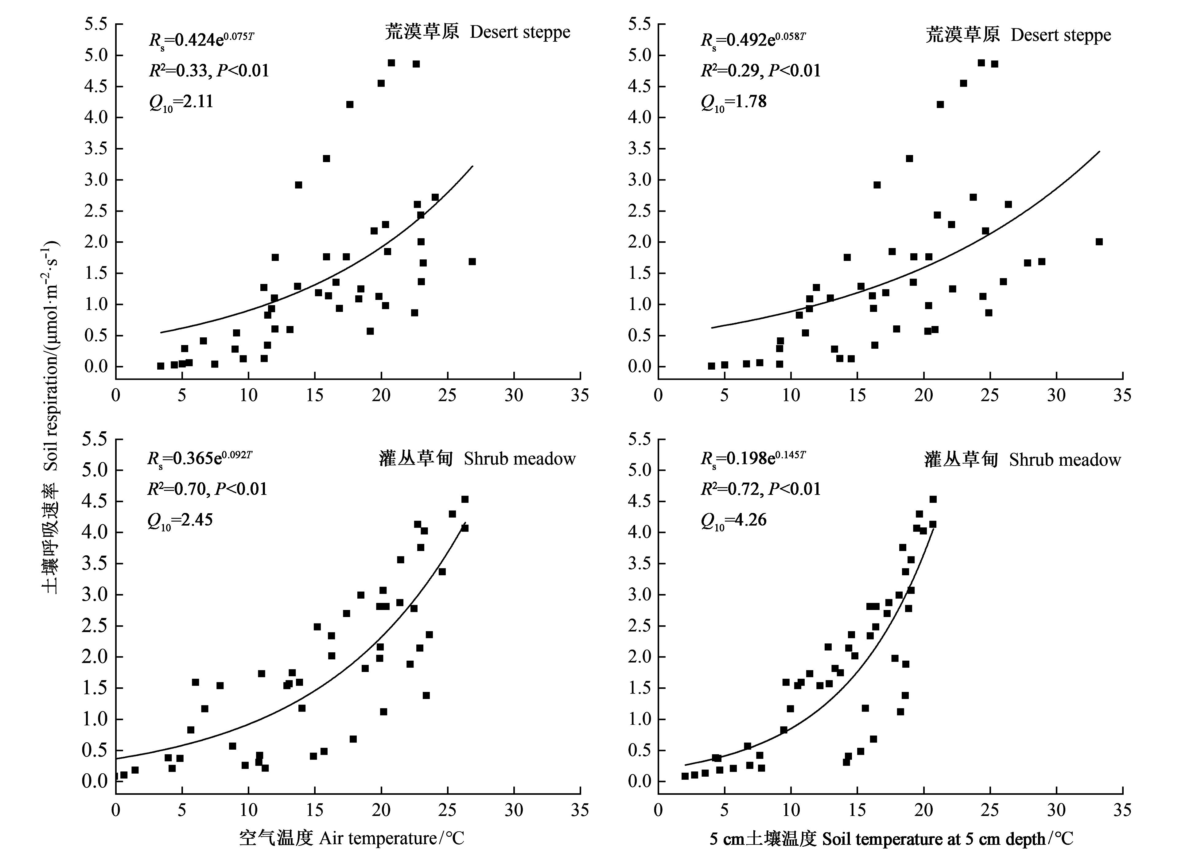 图4 荒漠草原和灌丛草甸月均土壤呼吸速和土壤日累积碳排放量注:不同小写字母表示相同草地类型不同月份间差异在P<0.05水平显著;不同大写字母表示相同月份不同草地类型间差异在P<0.05水平显著。