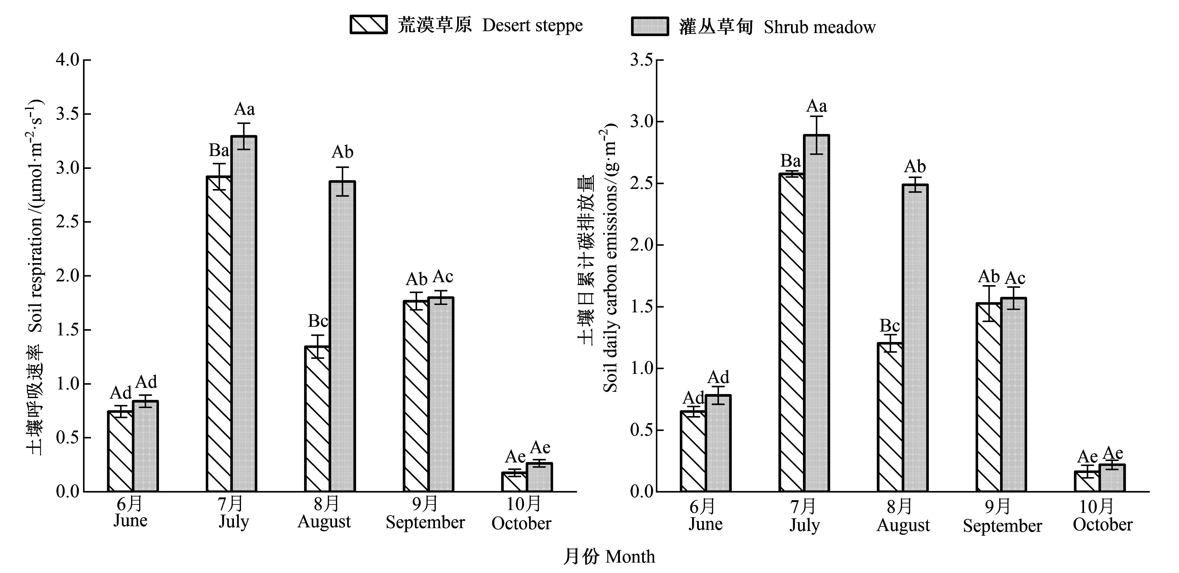 Fig.4 The monthly average sudden respiration rate and daily accumulated carbon emissions of desert steppe and shrub meadowNote:Different lowercase letters indicate significant differences between different months at P<0.05 level of the same grassland type; Different uppercase letters indicate significant differences between different grassland types at P<0.05 level of the same month.