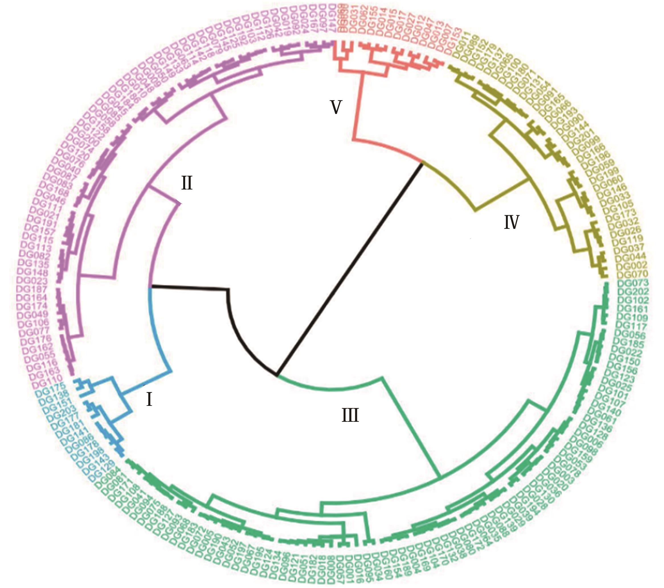 为揭示与陆地棉抗旱性紧密关联的农艺性状及生理生化指标,筛选出抗旱能力强的品种资源,以国内外203份陆地棉品种资源为试验材料,设置干旱胁迫和正常灌溉2个处理,测定不同棉花品种在2个处理下农艺性状及生理生化指标的差异,利用灰色关联度、抗旱综合度量值、综合抗旱系数、加权综合抗旱系数等方法,对203份陆地棉材料的抗旱性进行综合评价。结果表明,各性状指标与抗旱综合度量值(D值)间的紧密关系依次为:叶绿素含量>单铃重>衣分>株高>果枝数>始节位>叶面积>始节高>脯氨酸含量>果节数>有效结铃数>单株产量>丙二醛含量>超氧化物歧化酶活性;叶绿素含量、单铃重、衣分、株高、果枝数、始节位、叶面积、始节高与加权综合抗旱系数的关联度较大,可作为棉花抗旱性鉴定的重要指标。聚类分析表明,203份种质资源被划分为5个类群:第Ⅰ类为高抗旱型,包含鄂抗棉10、赣棉10、土库曼陆地棉等共12份品种,占5.9%;第Ⅱ类为抗旱型,包含KK-1543、豫棉15、皖棉8407等共62份品种,占30.5%;第Ⅲ类为中等耐旱型,包含晋棉6、新陆中48、鲁棉28等共80份品种,占39.4%;第Ⅳ类为敏旱型,包含豫棉17、17N8、农垦5等共35份品种,占17.3%;第Ⅴ类为高度敏旱型,包含新陆早24、新陆早29、冀棉12等共14份品种,占6.9%。研究成果为棉花抗旱育种提供了理论依据及材料支持。