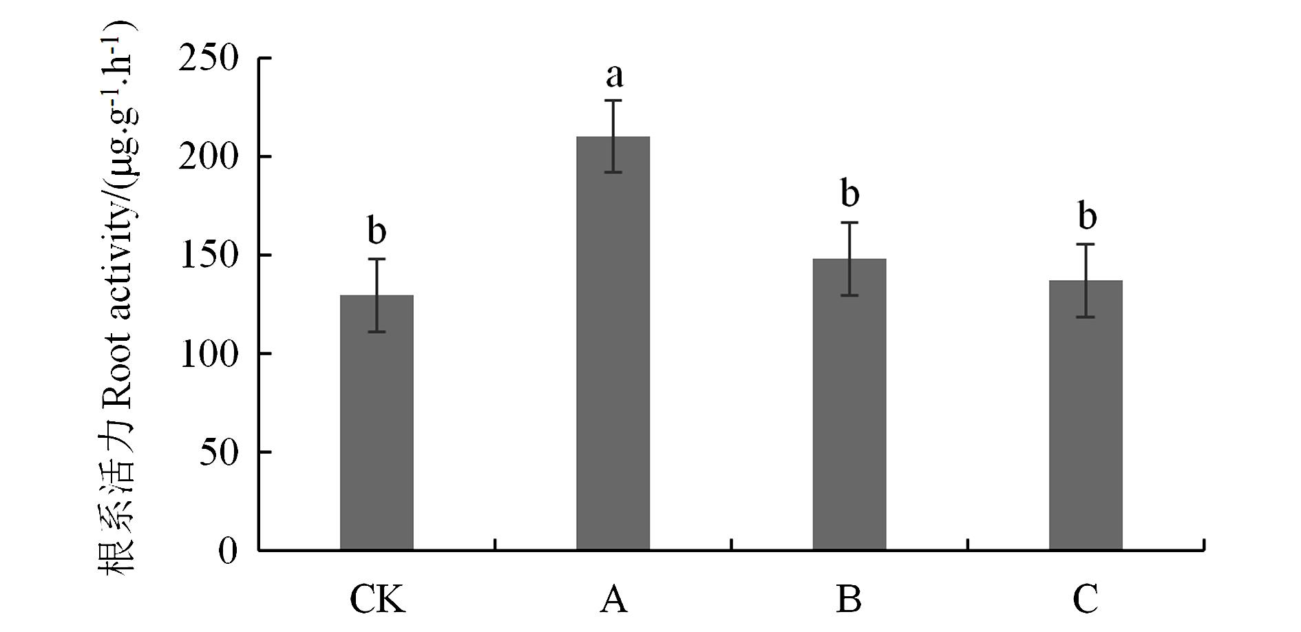 Fig.1 Root activities of flue-cured tobacco seedlings under different treatmentsNote:Different lowercase letters indicate significant differences between different treatments at P<0.05 level.