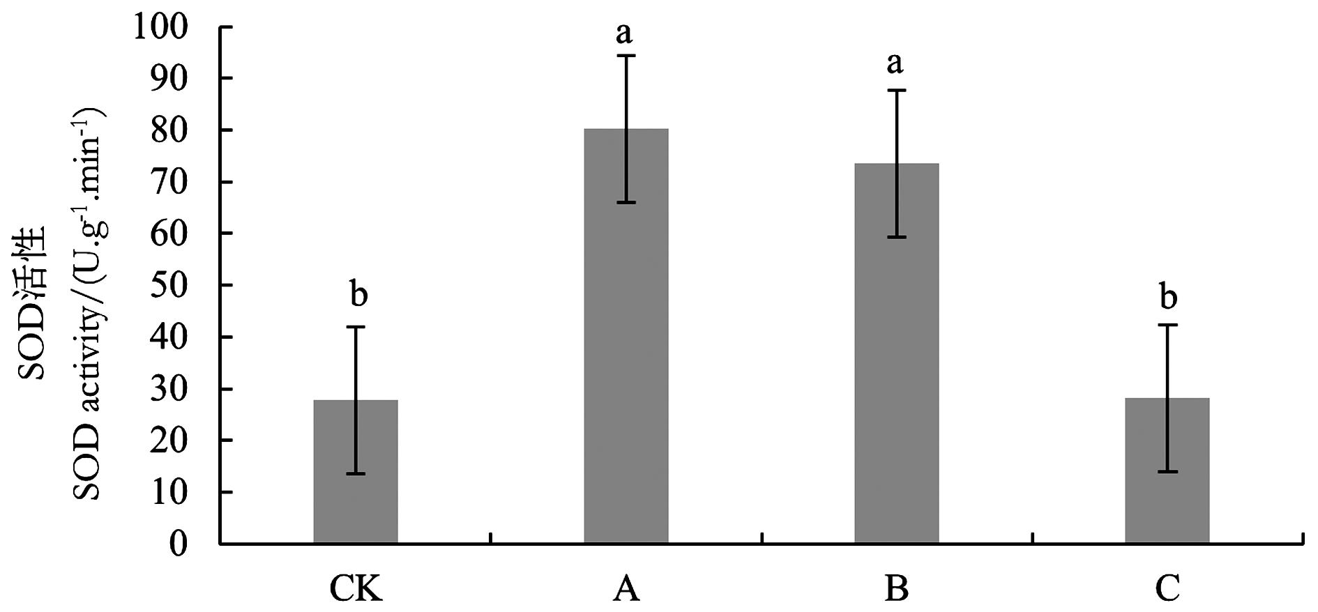 Fig.2 SOD activities in roots of flue-cured tobacco seedlings under different treatmentsNote:Different lowercase letters indicate significant differences between different treatments at P<0.05 level.