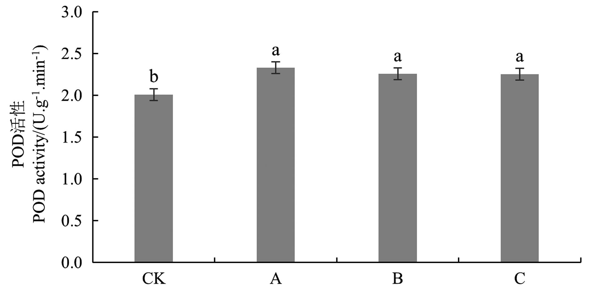 Fig.3 POD activities in roots of flue-cured tobacco seedlings under different treatmentsNote:Different lowercase letters indicate significant differences between different treatments at P<0.05 level.
