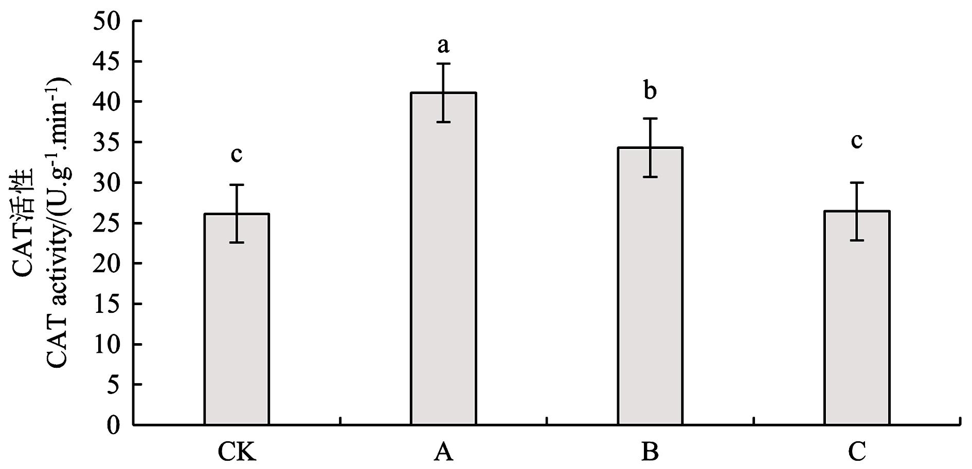 Fig.4 CAT activities in roots of flue-cured tobacco seedlings under different treatmentsNote:Different lowercase letters indicate significant differences between different treatments at P<0.05 level.