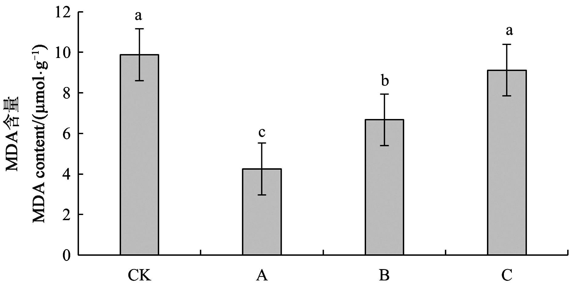 Fig.5 MDA contents in roots of flue-cured tobacco seedlings under different treatmentsNote:Different lowercase letters indicate significant differences between different treatments at P<0.05 level.
