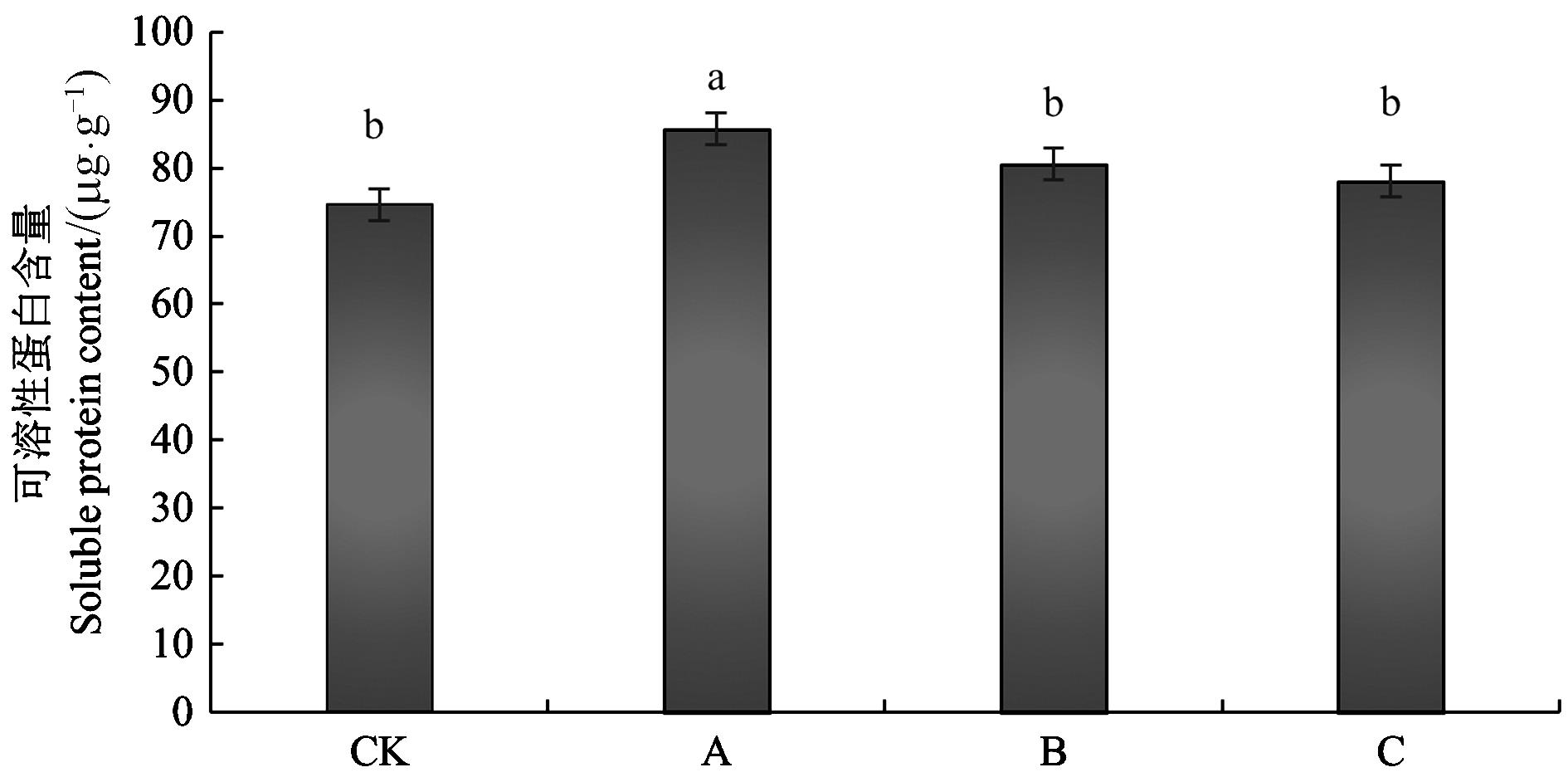 图6 不同处理下烟草幼苗根系的可溶性蛋白含量注:不同小写字母表示不同处理间差异在P<0.05水平显著。