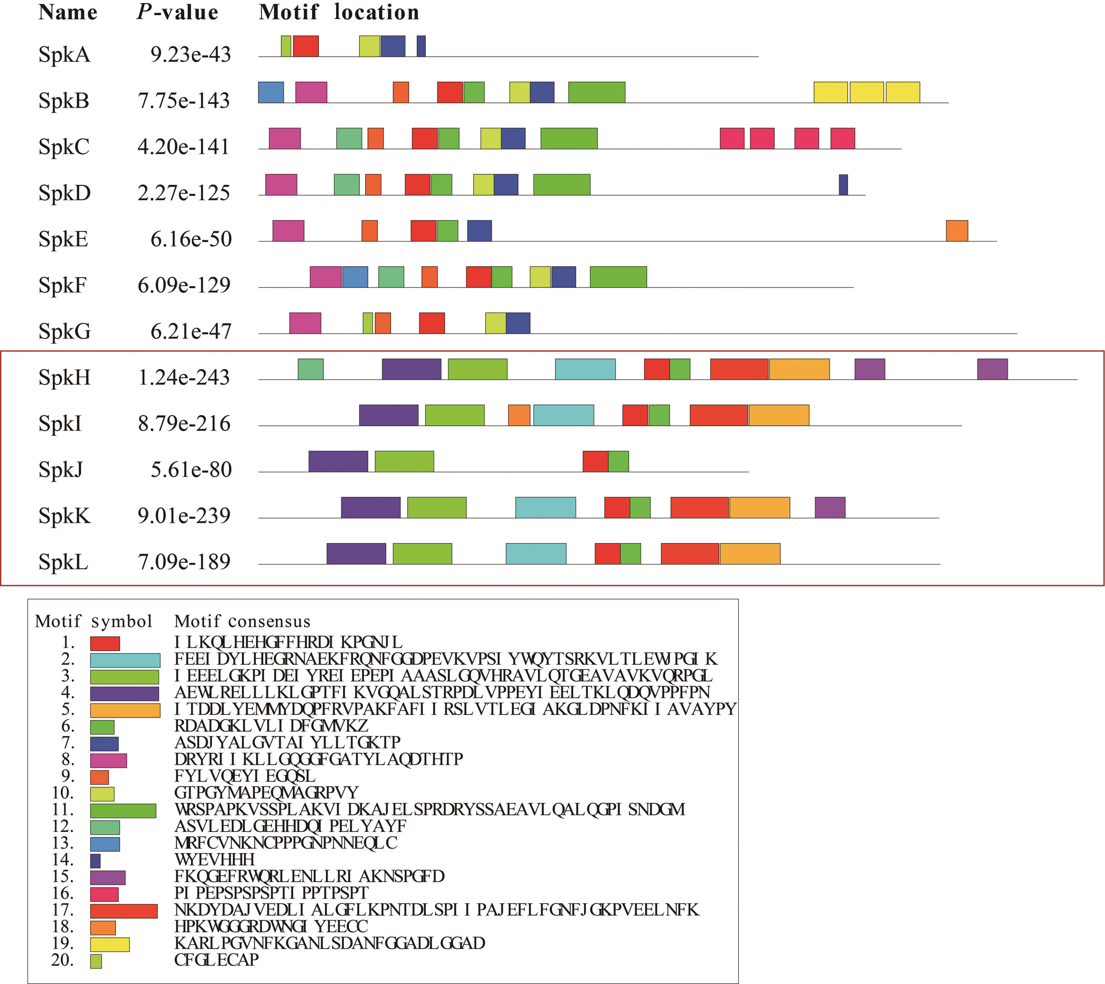 Fig. 2 Motif predictions of 12 Ser/Thr kinases in Synechocystis sp. PCC 6803Note:Amino acid sequences are retrieved from KEGG GENES database (https://www.genome.jp/kegg/genes.html); motif prediction is conducted on MEME website (https://meme-suite.org/).