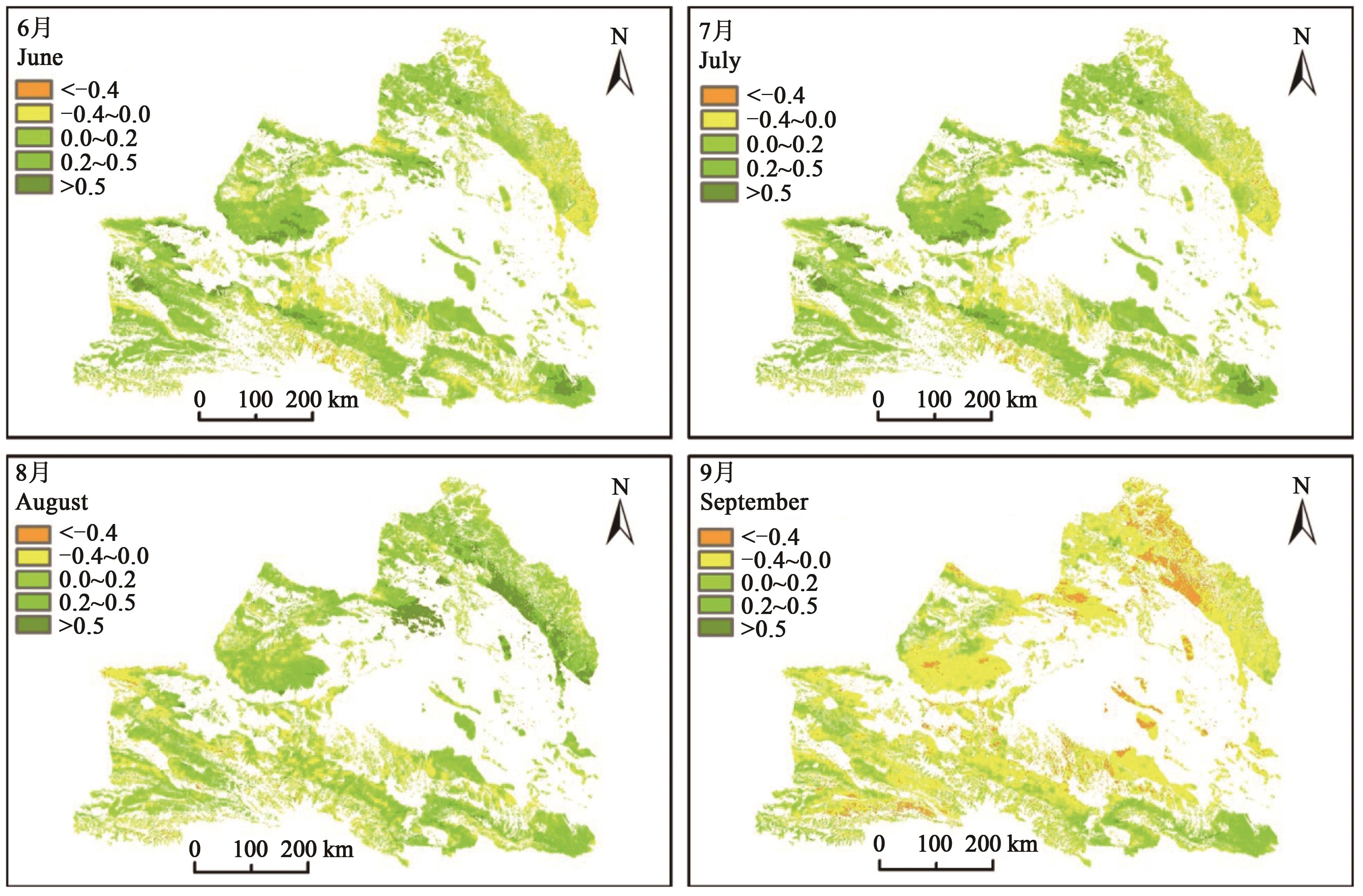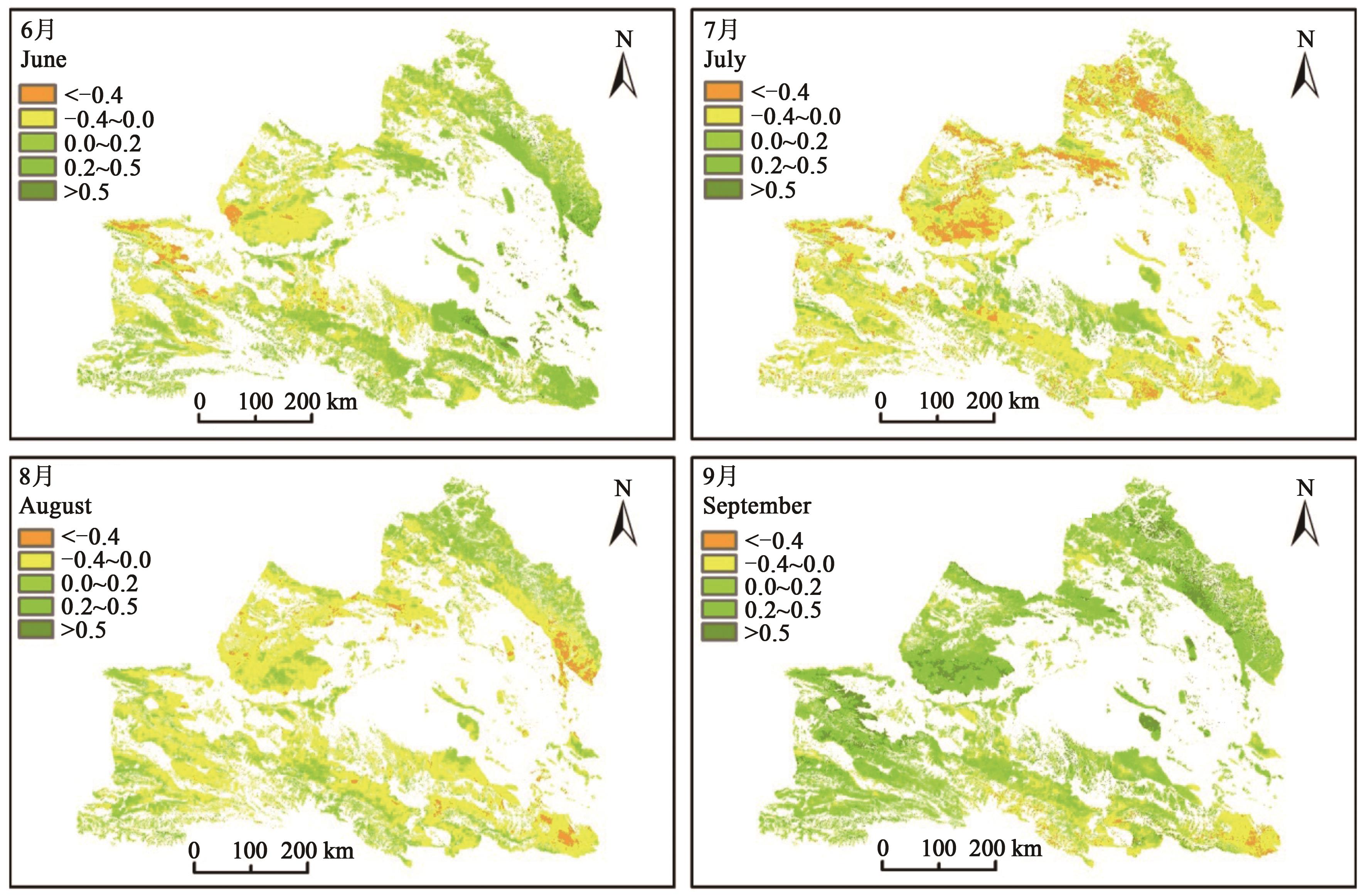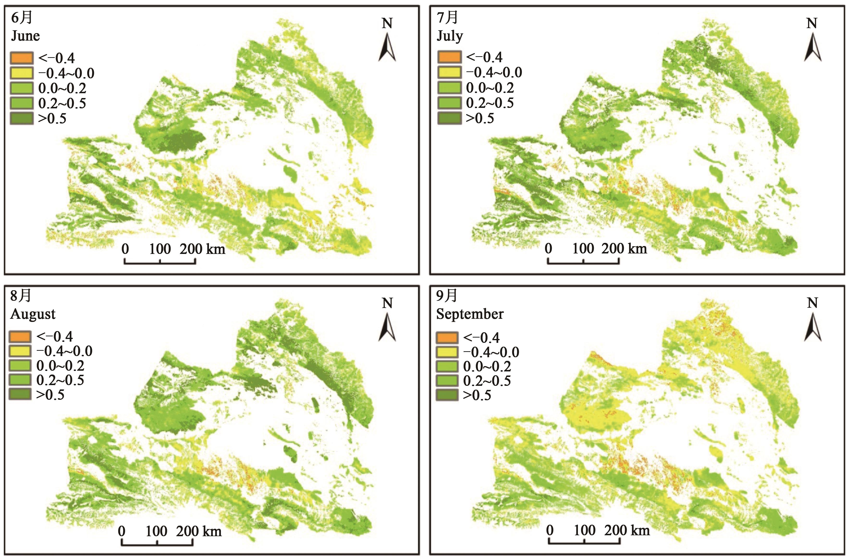 为分析北疆天然草地植被覆盖度在生长季不同月份的时空变化及其与气象因子的关系,采用像元二分模型、变化率分析和相关分析探讨了北疆1998—2018年6—9月天然草地植被覆盖度的时空变化及其与气象因子的关系。结果表明,北疆天然草地植被覆盖度空间上呈现降水较少、气温较高的中部和东部较低,海拔较高、降水较多且相对湿度较高的北部、西部和南部较高,由中部和东部向北部、西部和南部三面波动增加。北疆天然草地植被覆盖度在6、7、8和9月呈降低趋势,月平均值表现为6月>7月>9月>8月。北疆天然草地归一化植被指数7月为增加趋势,6、8和9月为减少趋势,整体上波动较小。6、7和8月北疆月平均天然草地植被覆盖度与降水和相对湿度呈正相关关系,9月与气温和日照时数呈正相关关系。