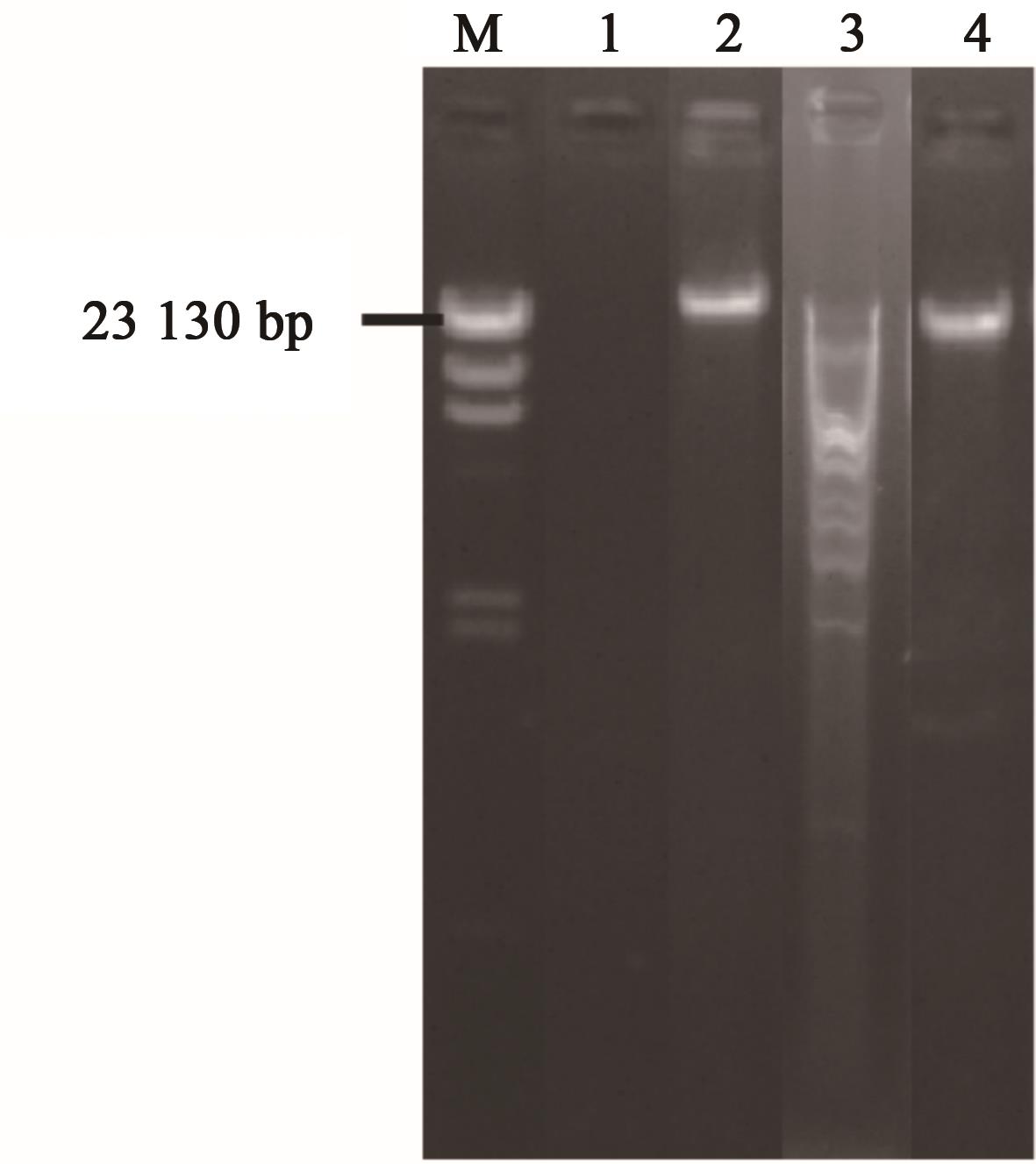 Fig. 1 Enzyme digestion of nuclear acid of phage RPZH6Note:M—λ HindⅢ DNA marker; 1—DNase Ⅰ treatment; 2—RNase A treatment; 3—EcoRⅠ treatment; 4—RPZH6 nucleic acid.