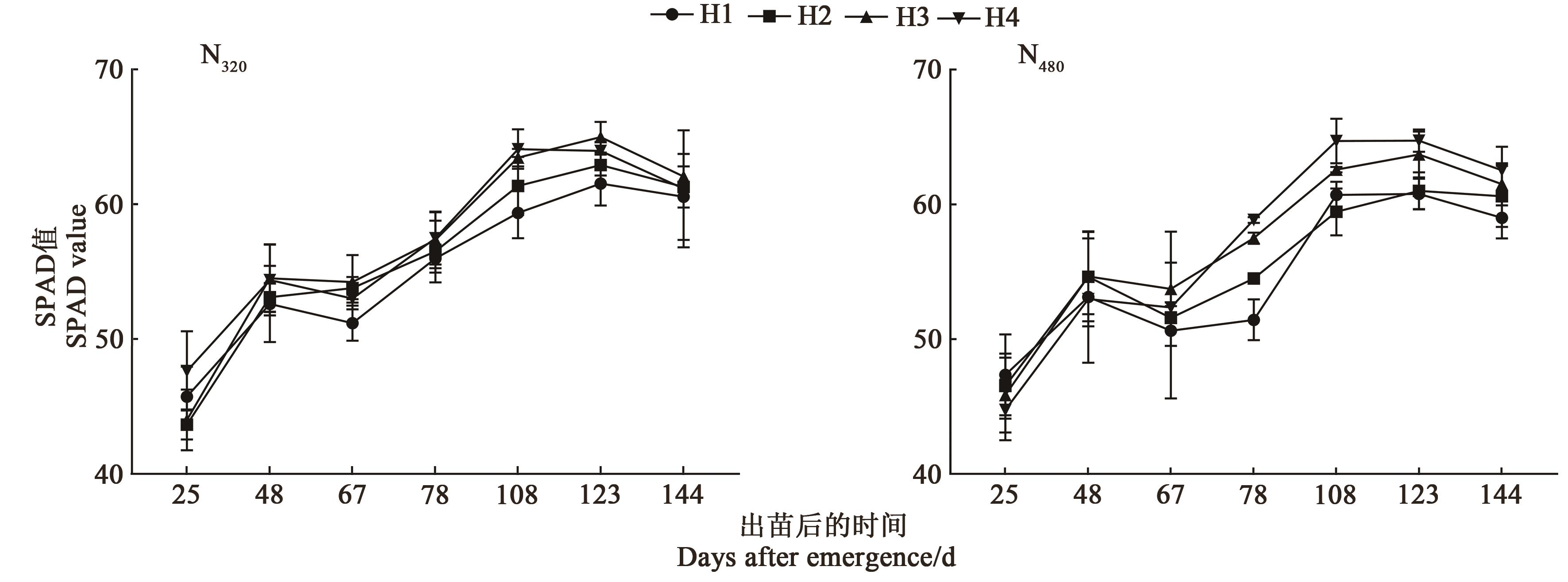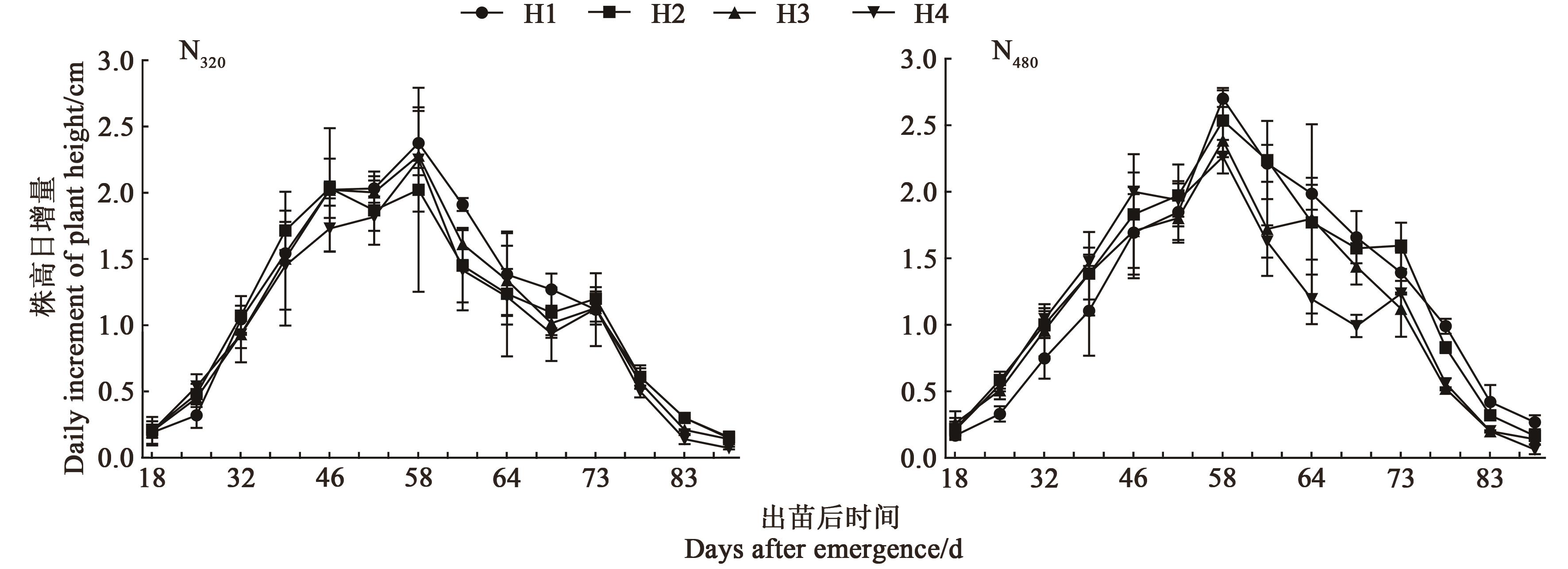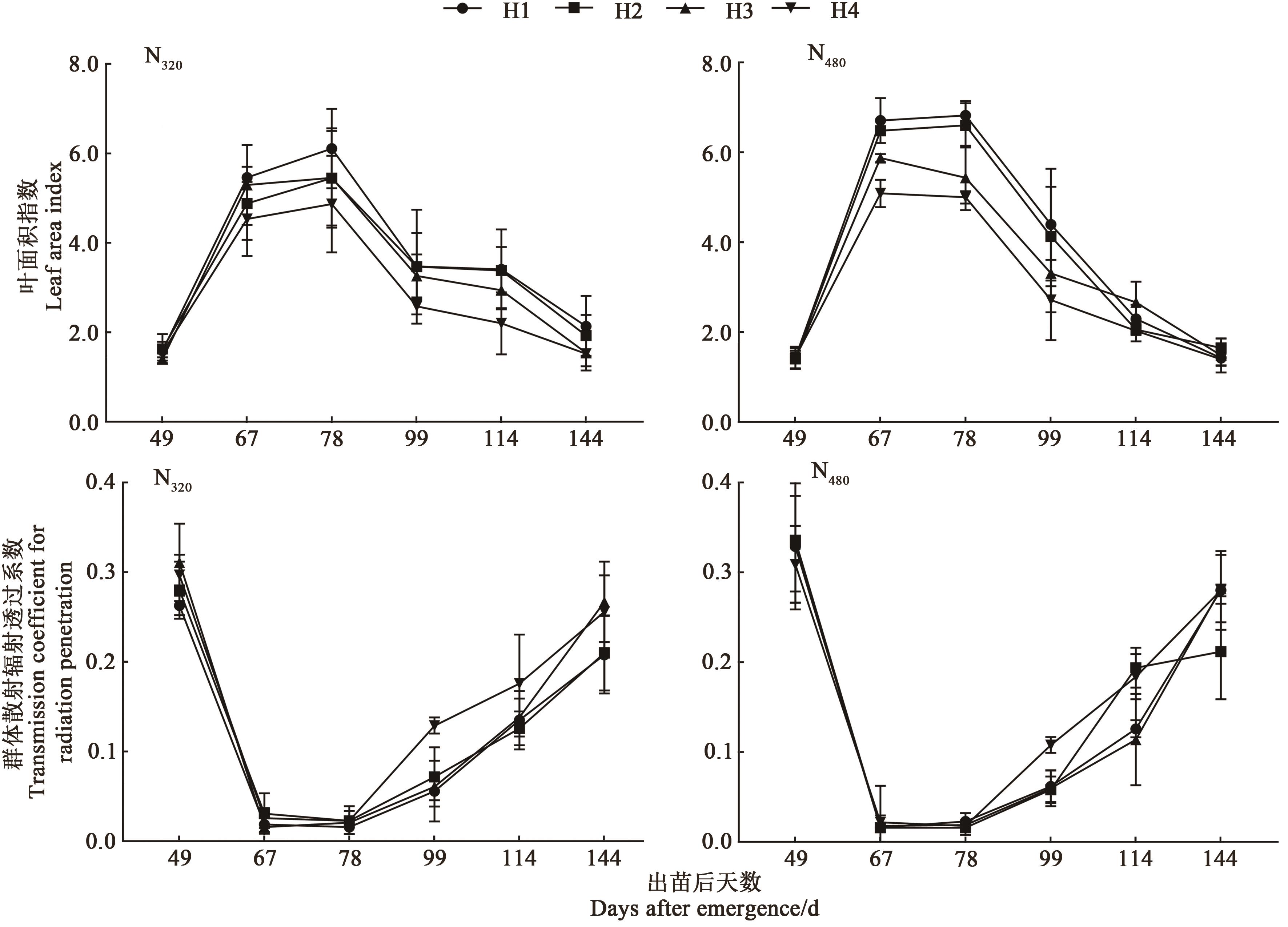 为研究缩节胺对不同施氮量棉田的调控作用,以新陆中88号为材料,采用双因素裂区试验设计,设置320(N320)和480 kg·hm-2(N480)2个纯氮水平和67.0(H1)、150.0(H2)、260.5(H3)、371.0 g·hm-2 (H4)4个缩节胺剂量水平,研究不同处理下机采棉的株高日增量、株型、叶面积、比叶重及产量的变化。结果表明,各处理的冠层株型指标无显著差异,叶面积指数表现为随施氮量增多而增大;上部主茎节间长度、中上部果枝长度随缩节胺剂量增多而降低。N320水平下棉花叶片SPAD值和散射辐射透过系数(TC)较高;且在H3处理下,主茎叶片比叶重、单株结铃数及单铃重最大,施氮量和缩节胺用量对籽棉产量存在互作效应。综上,施氮量增多使棉花徒长,中期通风透光差;缩节胺剂量增多对棉花株型有明显抑制效果,但会降低单株结铃数与单铃重。因此,施氮量和缩节胺用量分别为320.0 kg·hm-2和260.5 g·hm-2时有利于塑造良好株型,既可以保持棉花后期较高的叶面积指数,又可使田间中期保持良好的通风透光性,增加单株结铃数与单铃重,进而提高产量。