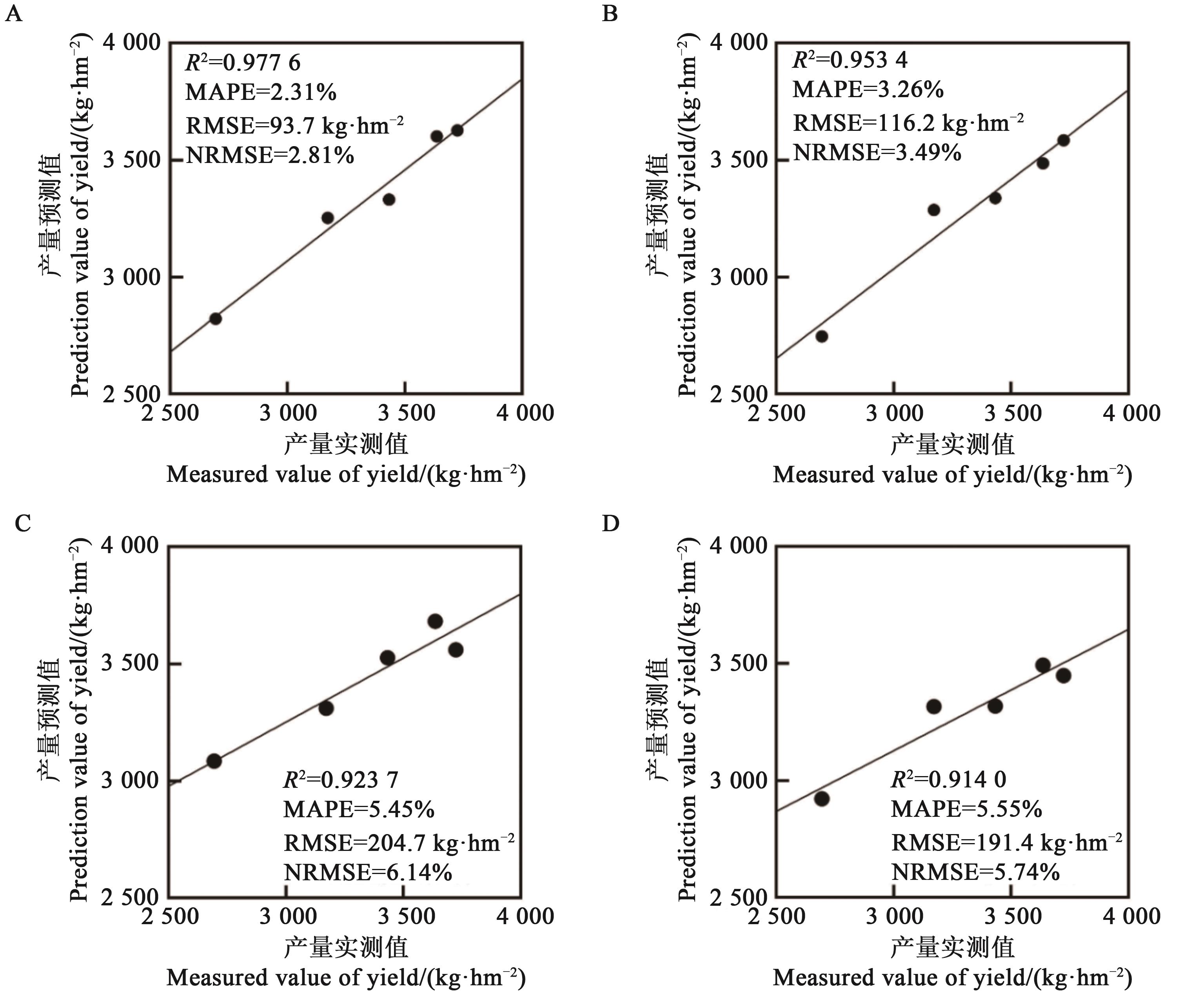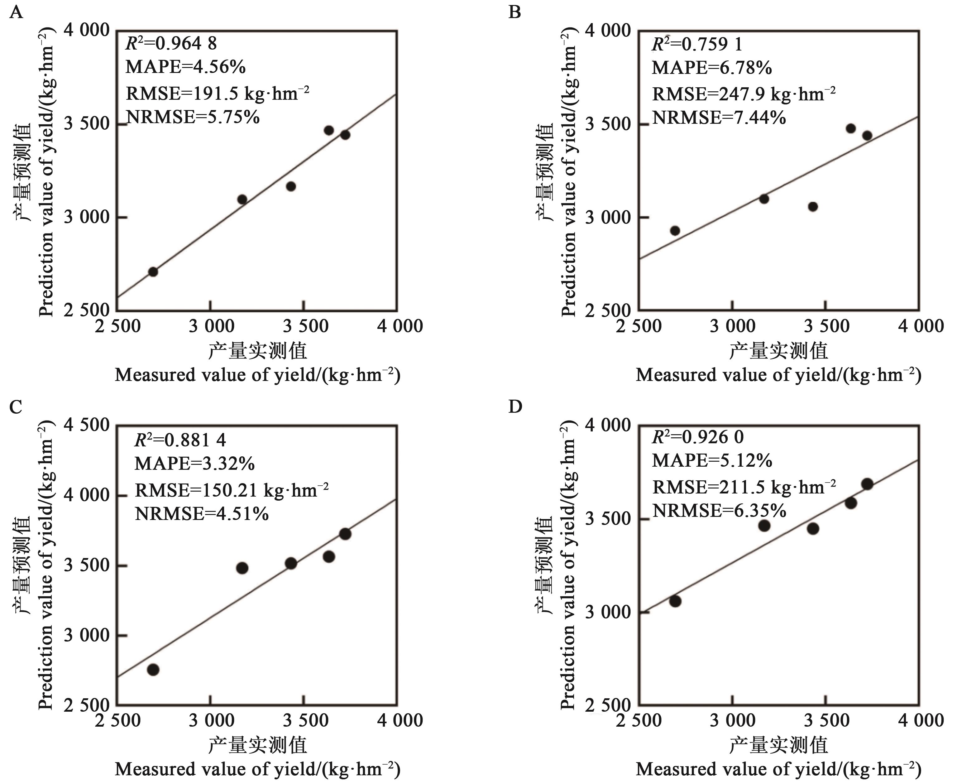 图1 高度20 m花铃期和吐絮期产量估算模型验证结果A:花铃期-逐步回归;B:花铃期-因子分析;C:吐絮期-逐步回归;D:吐絮期-因子分析