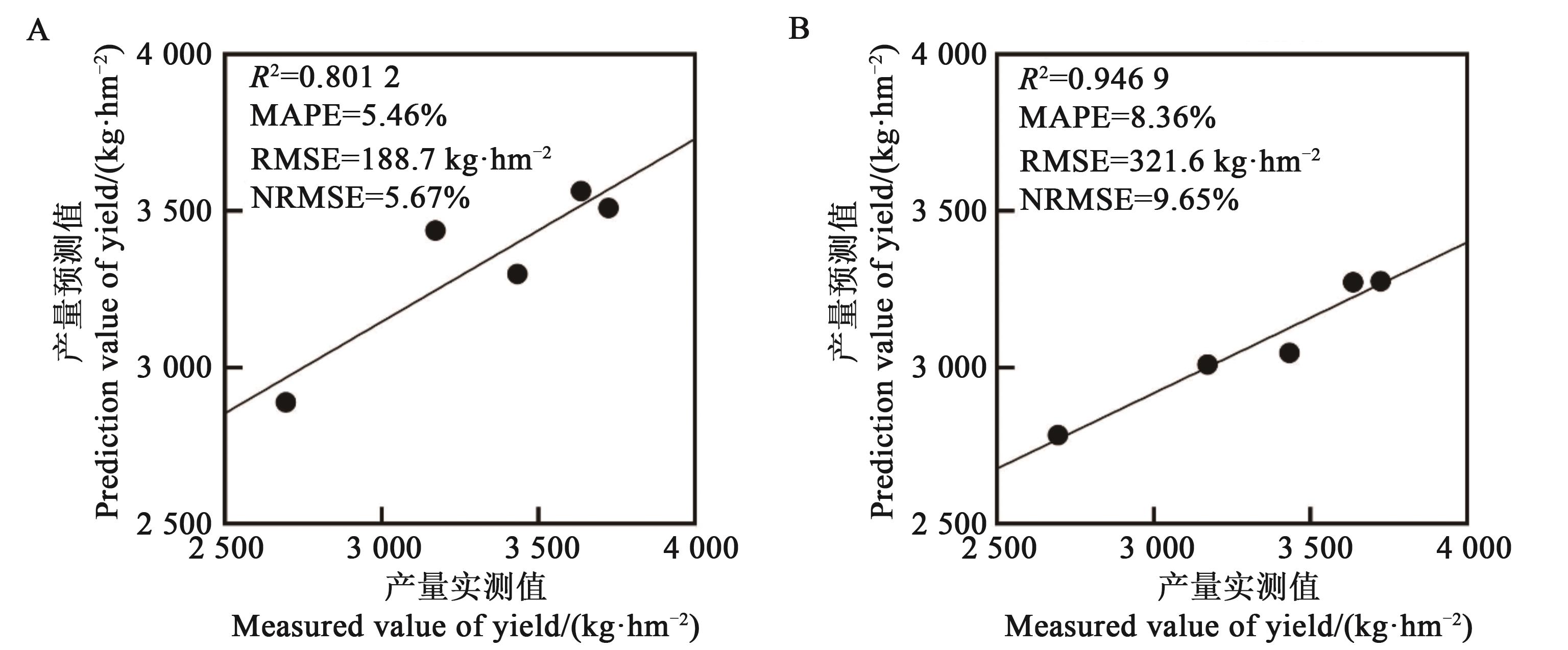 图3 高度40 m吐絮期产量估算模型验证结果A:吐絮期-逐步回归;B:吐絮期-因子分析