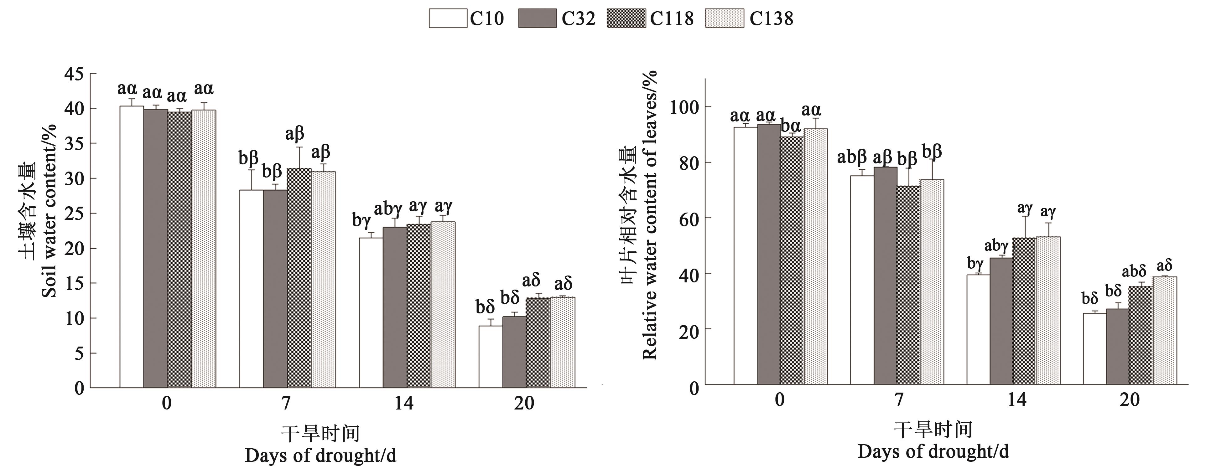图1 干旱胁迫下不同狗牙根的土壤含水量和叶片相对含水量注:不同英文字母表示同一处理时间不同材料间在P<0.05水平差异显著;不同希腊字母表示同一材料不同处理时间在P<0.05水平差异显著。
