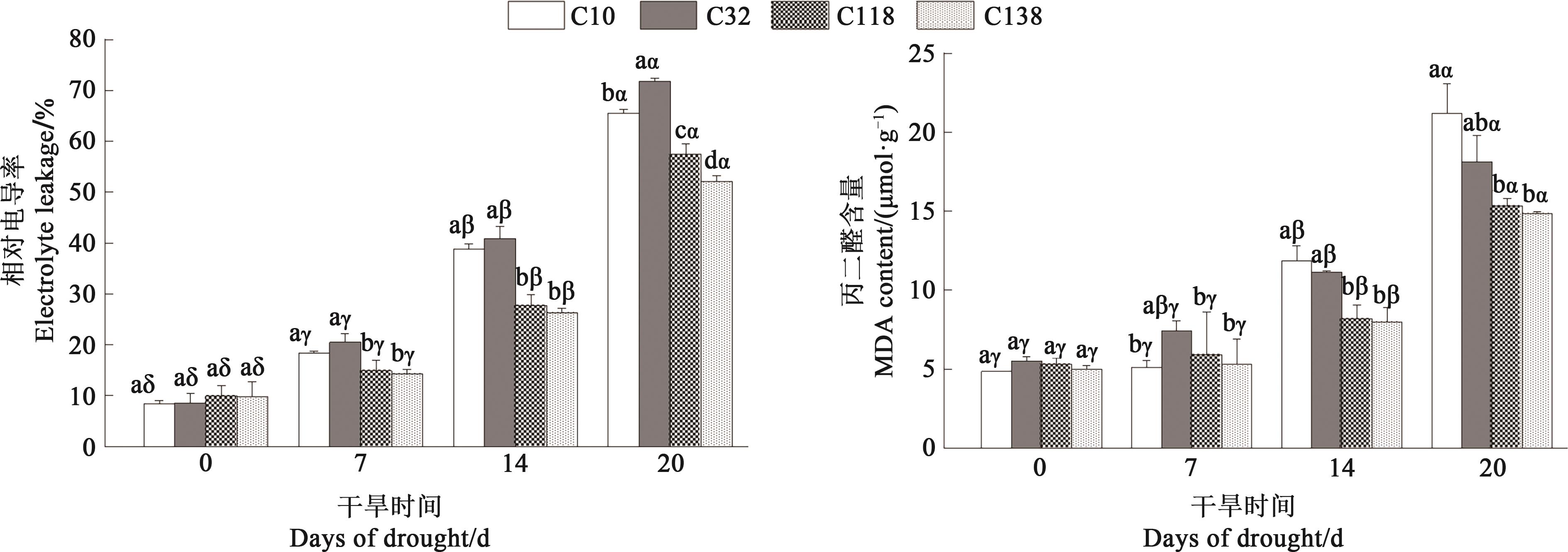 图2 干旱胁迫下不同狗牙根叶片相对电导率和丙二醛含量注:不同英文字母表示同一处理时间不同材料间在P<0.05水平差异显著;不同希腊字母表示同一材料不同处理时间在P<0.05水平差异显著。