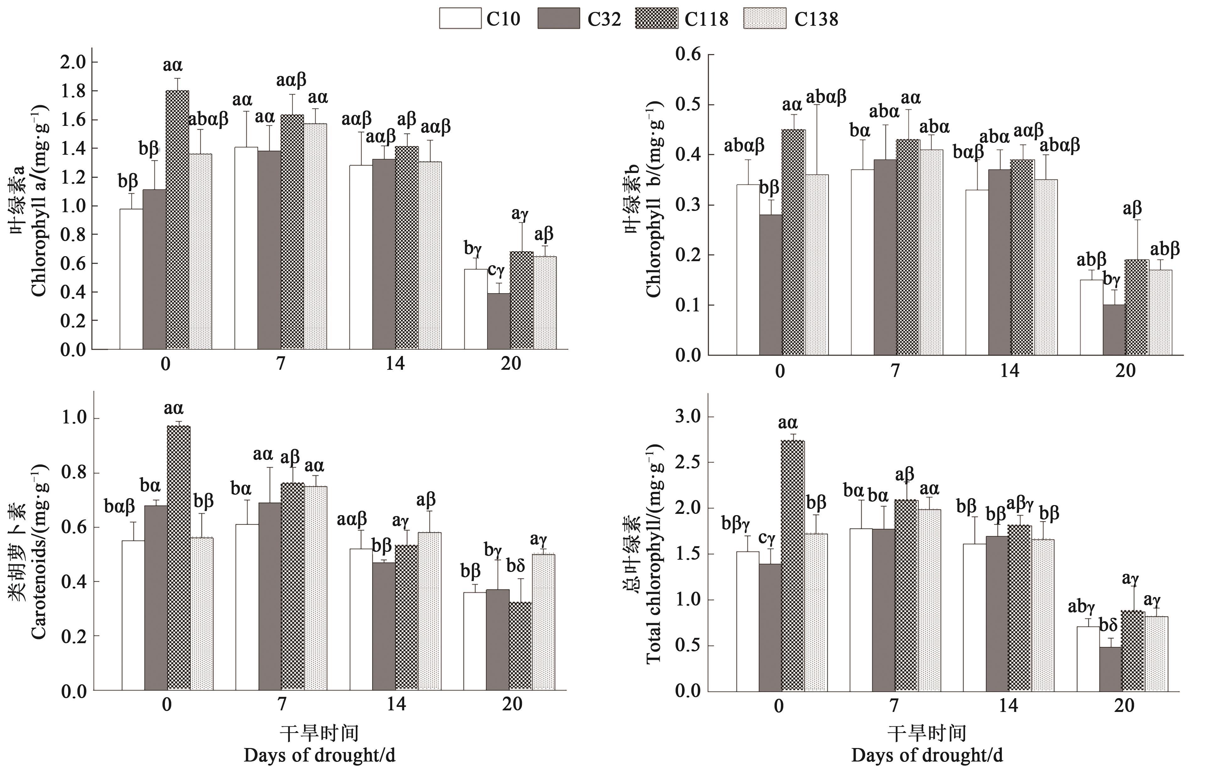 Fig. 3 Photosynthetic pigment content of different bermudagrass under drought stressNote: Different English letters indicate significant differences between different materials under same treatment time at P<0.05 level; different Greece letters indicate significant differences between different treatment times of same material at P<0.05 level.
