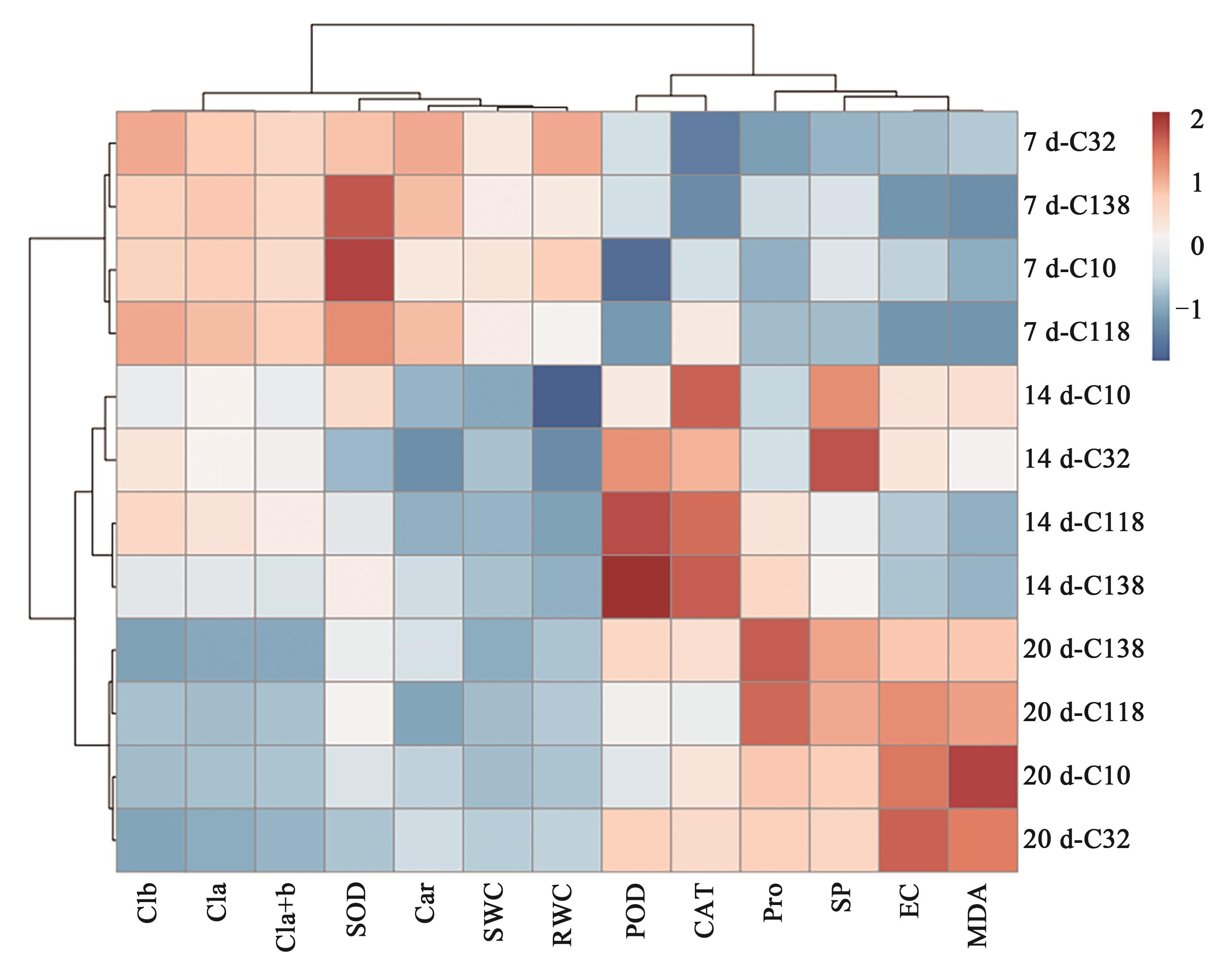 Fig. 6 Heat map cluster analysis of each index of 4 bermudagrass under drought treatment for 7~20 dNote: Clb—Chlorophyll b content;Cla—Chlorophyll a content;Cl(a+b)—Chlorophyll (a+b) content;SOD—Superoxide dismutase activity;Car—Carotenoid content;SWC—Soil water content;RWC—Relative water content in leaf;POD—Peroxidase activity;CAT—Catalase activity;Pro—Proline content;SP—Soluble protein content;EC—electrical conductivity;MDA—Malondialdehyde content; and 7 d, 14 d, 20 d represent the drought treatment time.