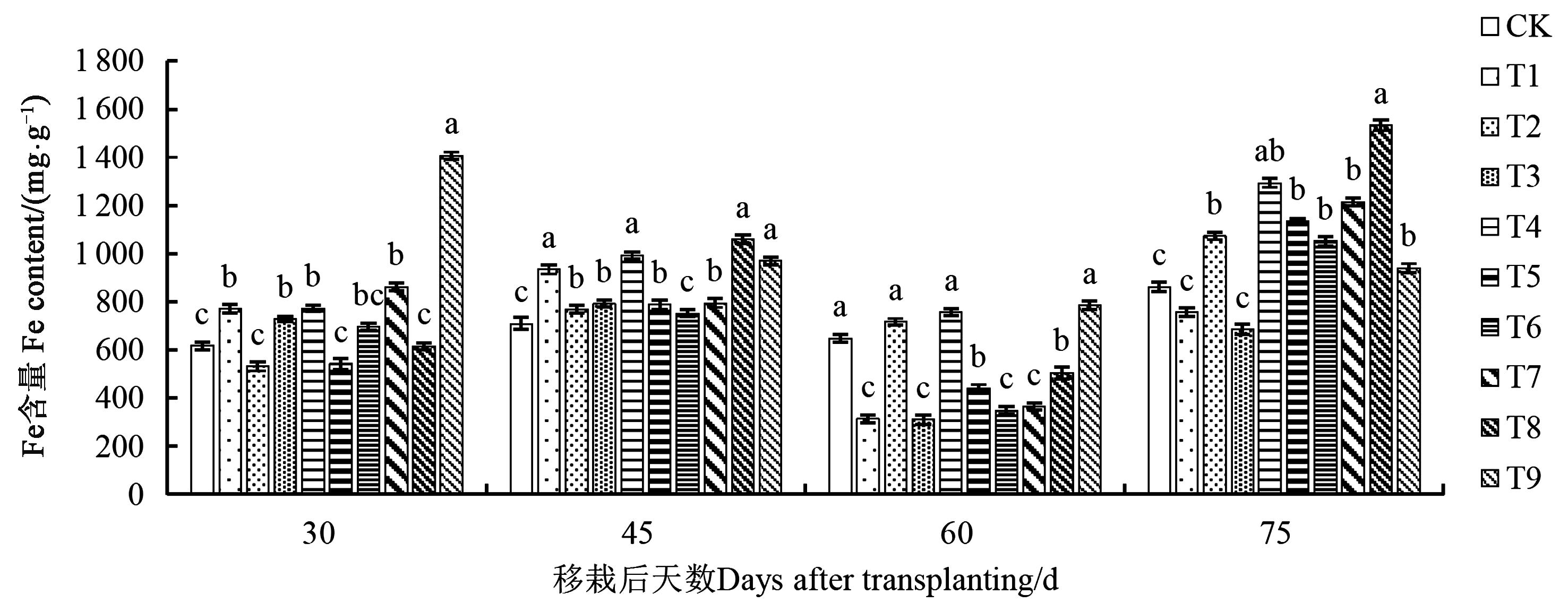 Fig. 6 Fe contents in middle leaves of cigar under different treatmentsNote: Different lowercase letters indicate significant differences between different treatments of same stage at P<0.05 level.