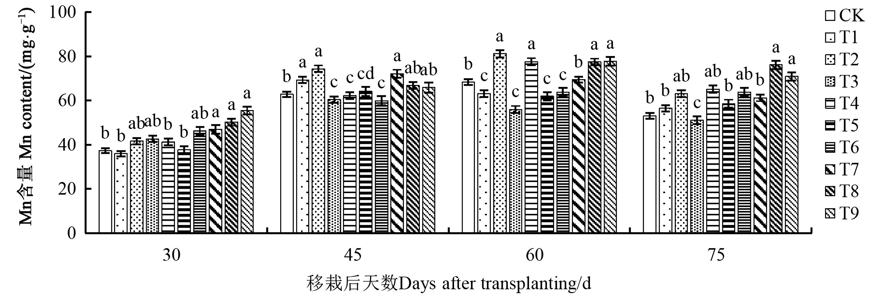 图7 不同处理下雪茄烟中部叶的Mn含量注:不同英文小写字母表示同一时期不同处理间在P<0.05水平差异显著。