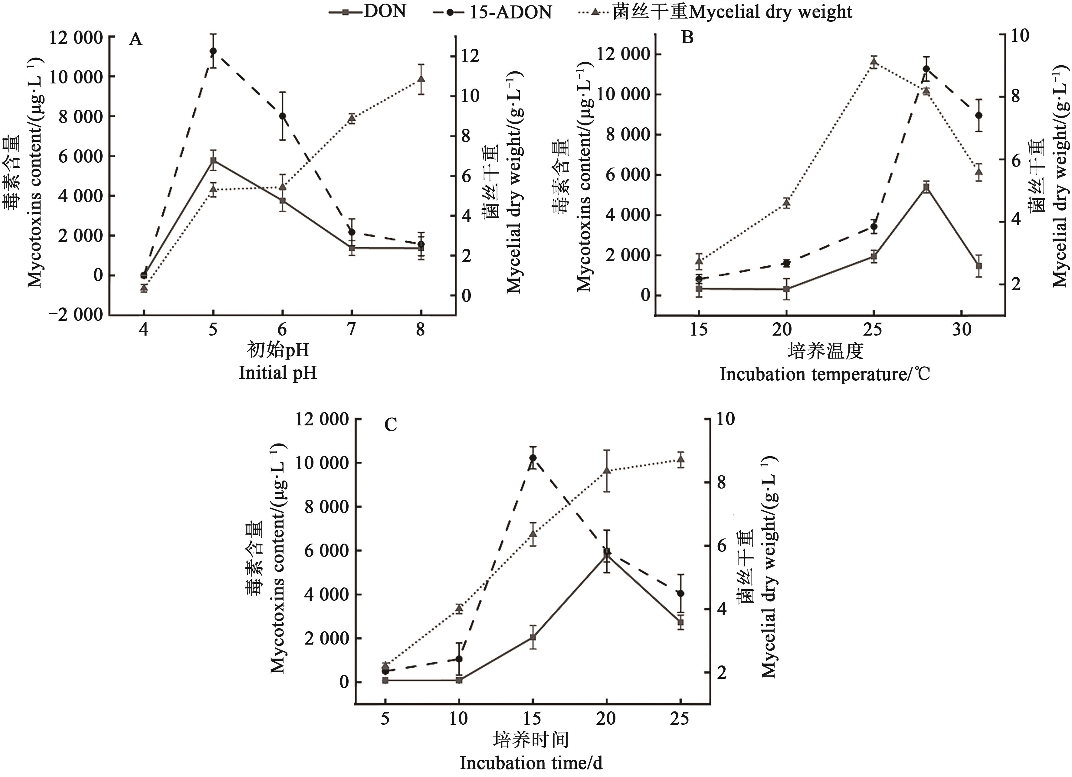 Fig. 3 Growth of strains and production of DON and 15-ADON under different cultural conditionsA: Initial pH; B: Incubation temperature; C: Incubation time