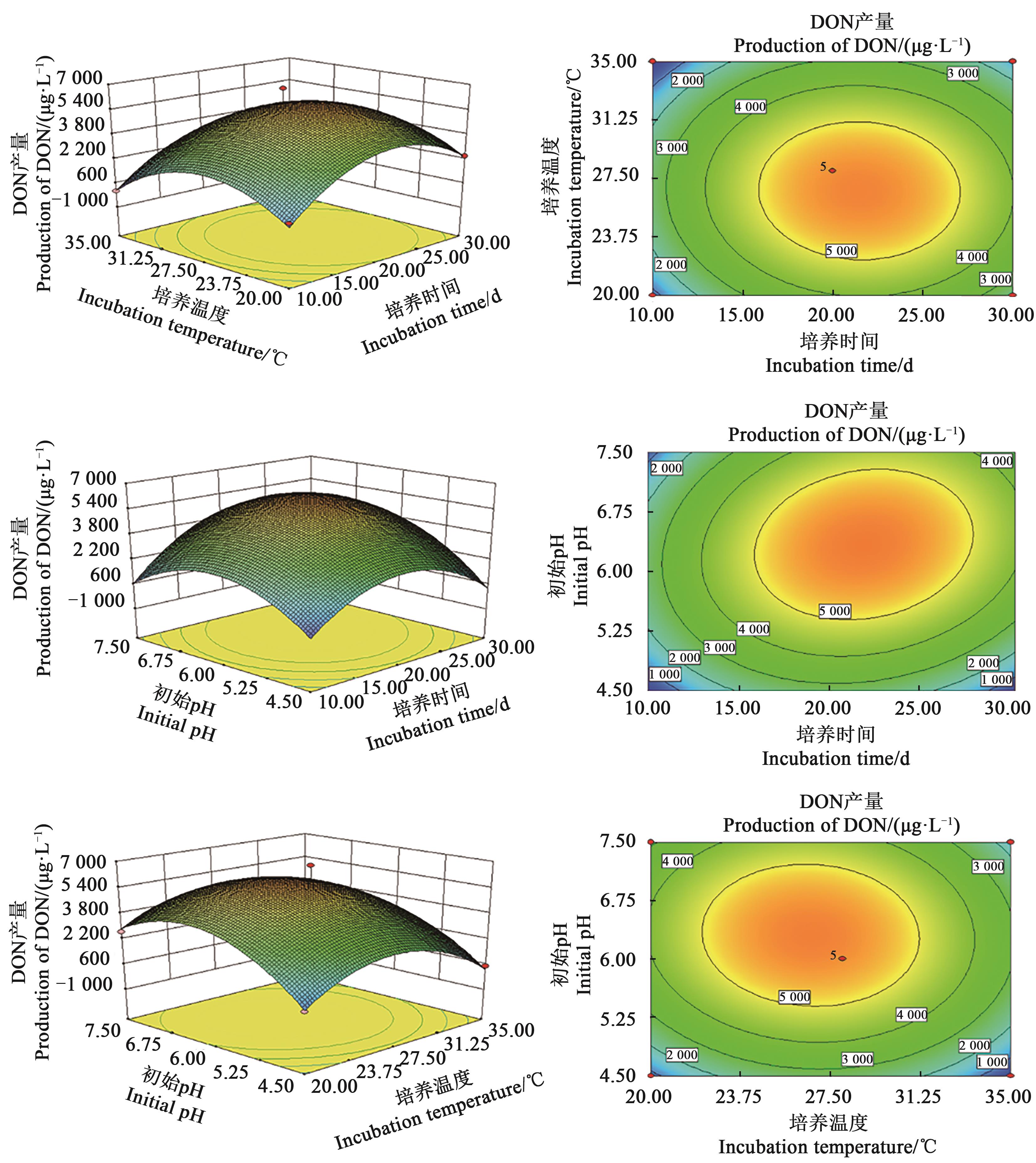 图4 培养时间、培养温度和初始pH交互结果对DON的产量的响应面及等高线图