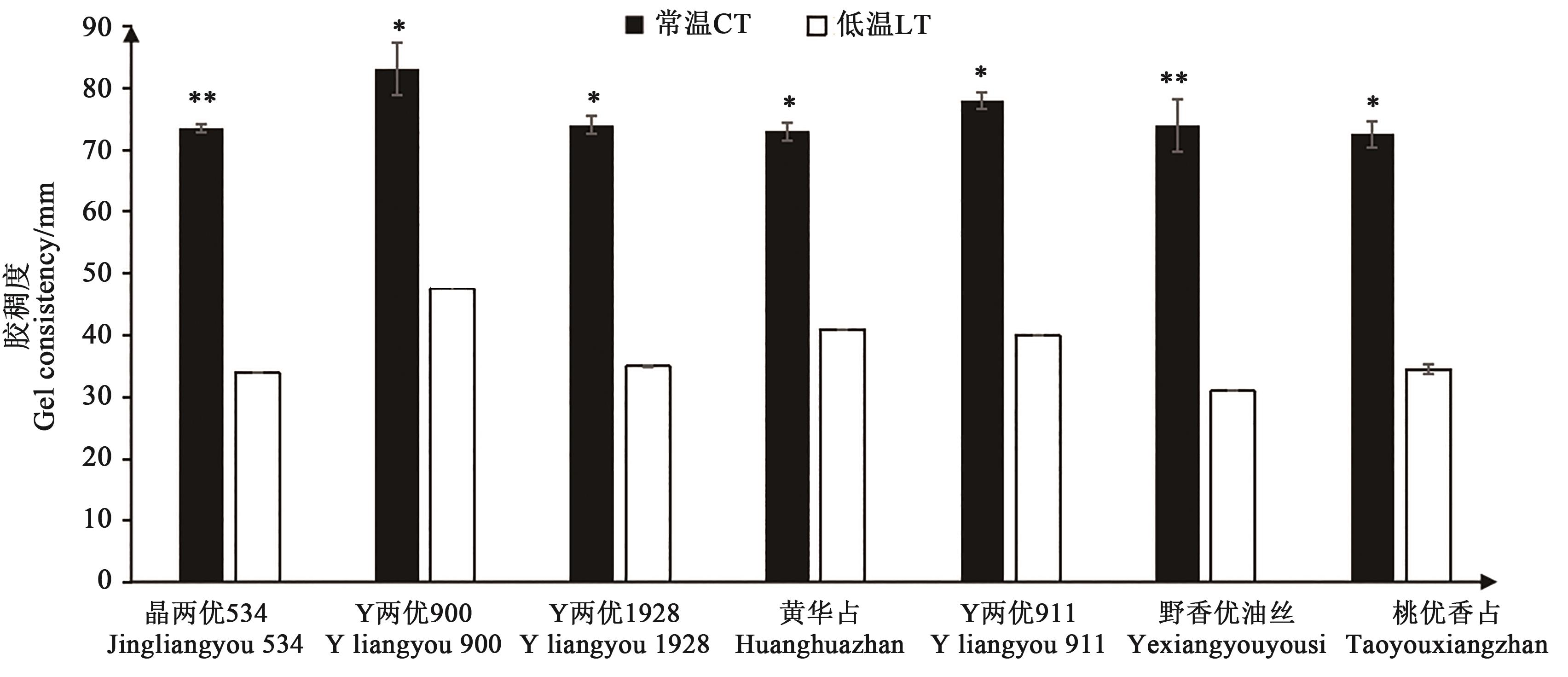 Fig. 2 Effect on gel consistency of natural low temperature during grain filling stage of riceNote: * and ** indicate significant differences between different treatments of same variety at P<0.05 and P<0.01 levels, respectively.