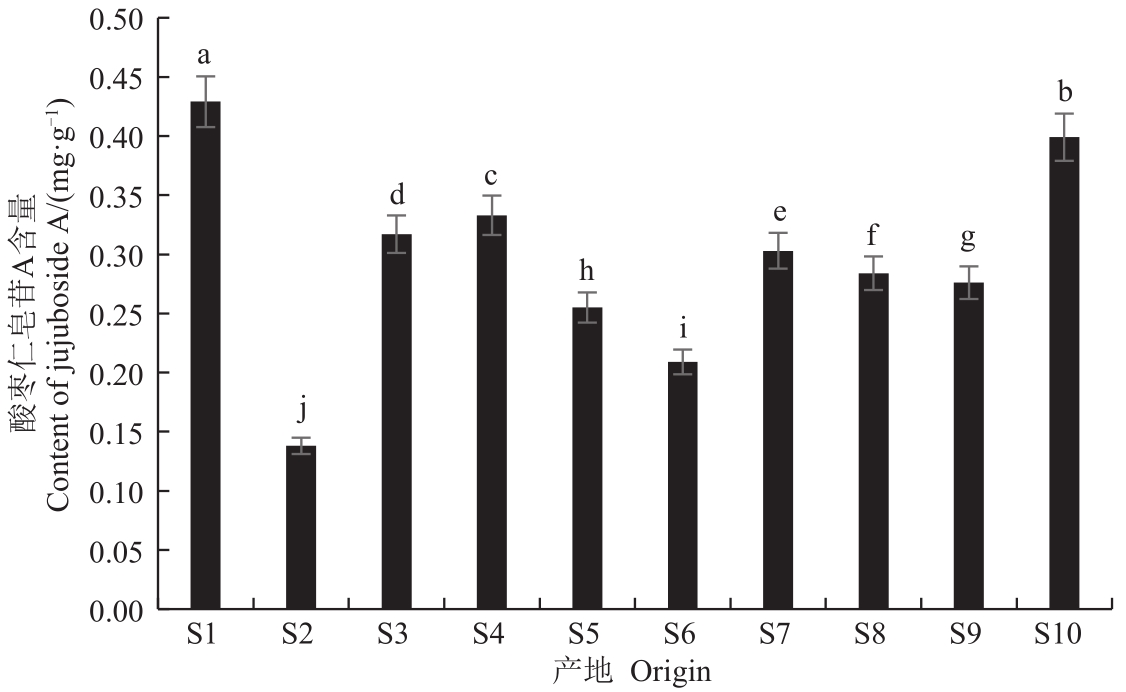 Fig. 1 Content of jujuboside A in seed kernel of sour jujube from different originsNote:Different lowercase letters indicate significant differences at P<0.05 level.