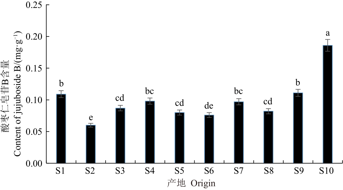 Fig. 2 Content of jujuboside B in seed kernel of sour jujube from different originsNote:Different lowercase letters indicate significant differences at P<0.05 level.
