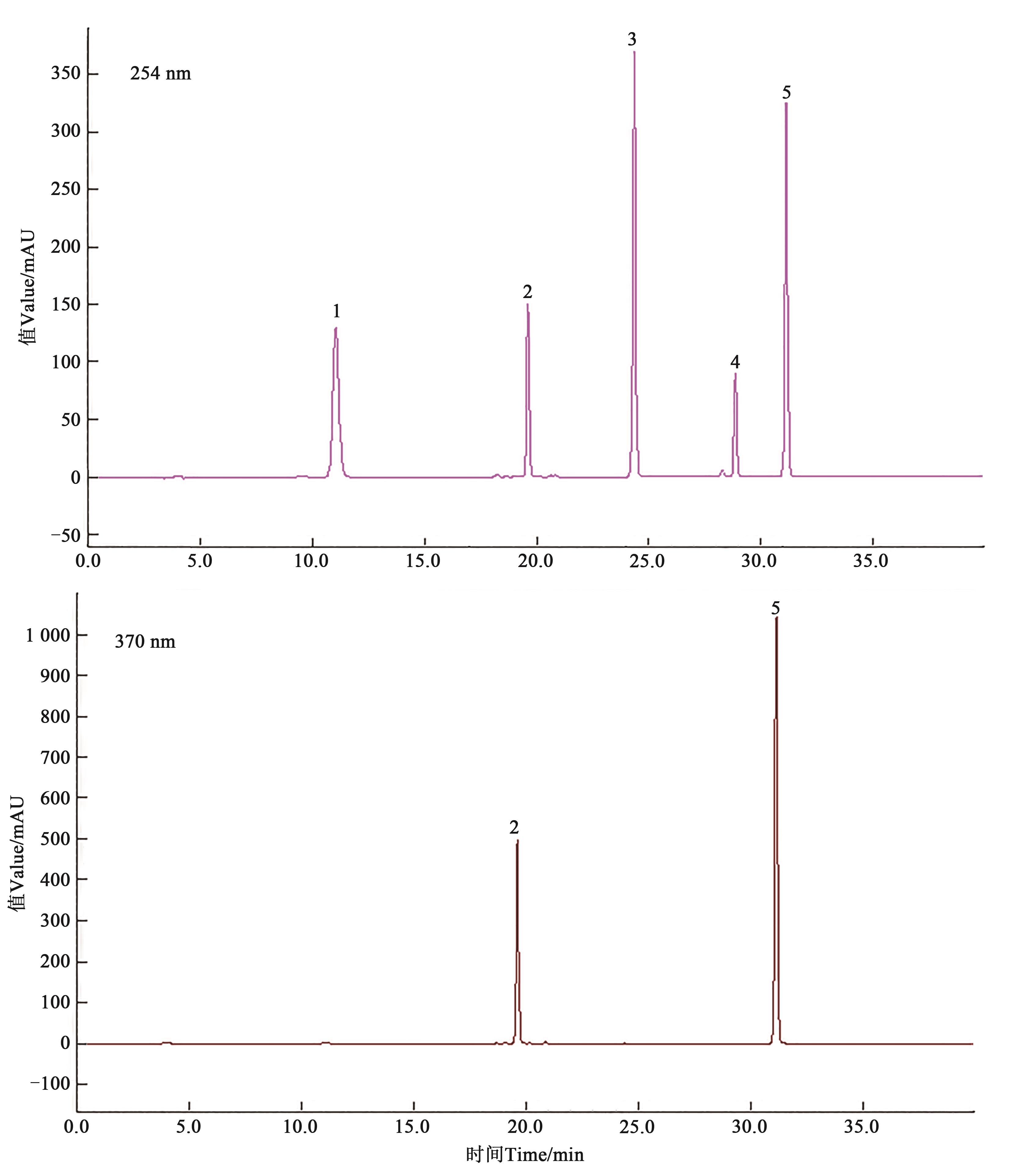 Fig. 1 Chromatograph of reference substanceNote: 1—Liquiritin; 2—Isobliquorin; 3—Glycyrrhizin; 4—Glycyrrhizic acid; 5—Isoglycyrrhizin.