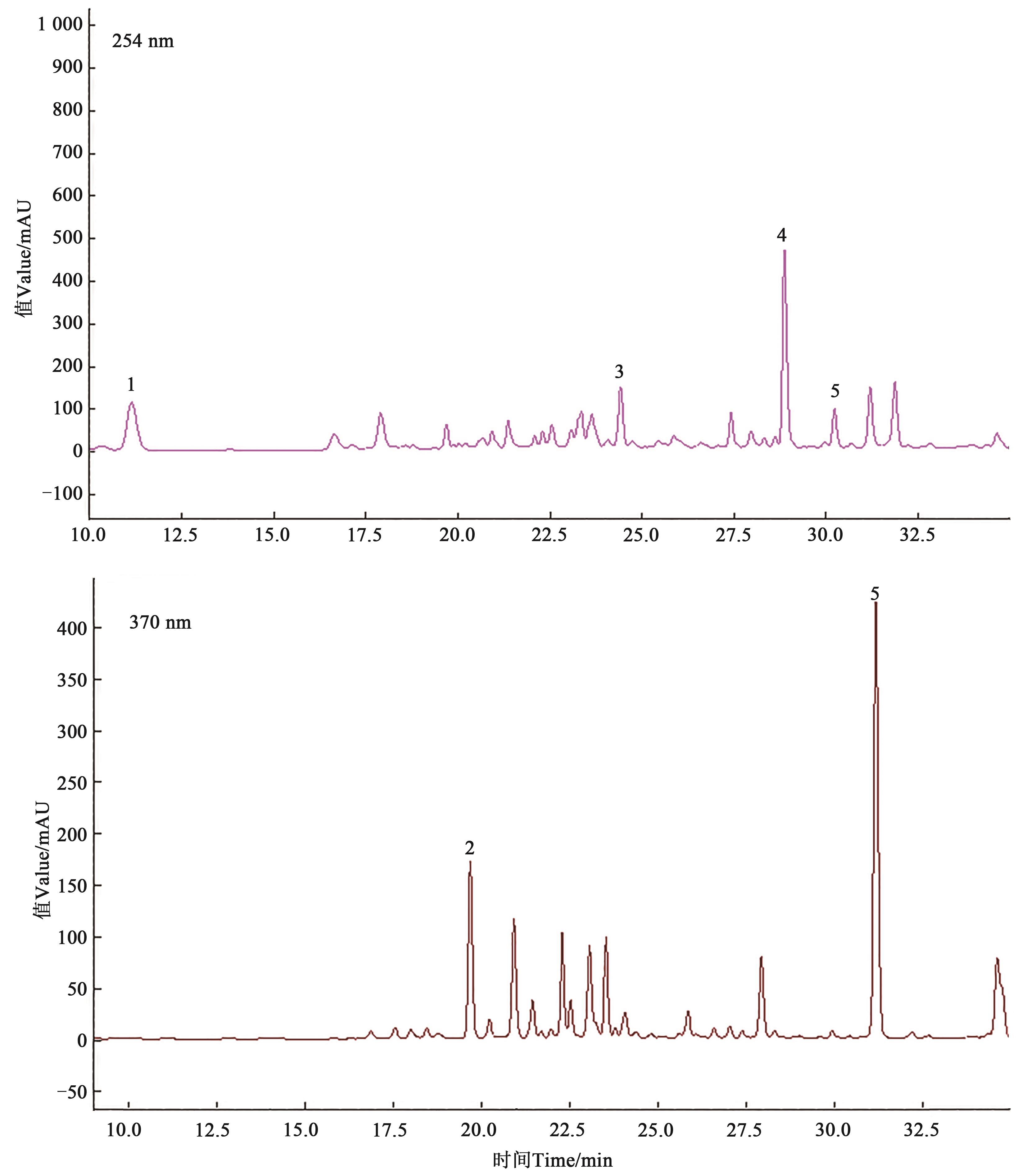 Fig. 2 Chromatograph of samplesNote: 1—Liquiritin; 2—Isobliquorin; 3—Glycyrrhizin; 4—Glycyrrhizic acid; 5—Isoglycyrrhizin.