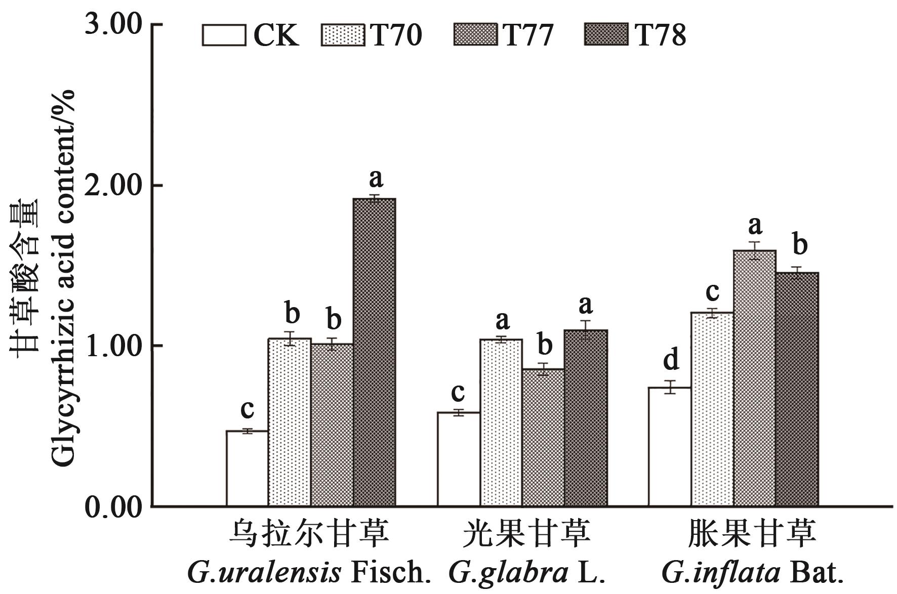 图3 不同根瘤菌处理下甘草的甘草酸含量注: 不同小写字母表示不同处理间在P<0.05水平差异显著。