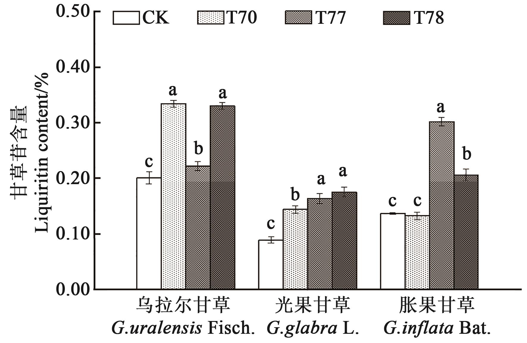 图4 不同根瘤菌处理下甘草的甘草苷含量注: 不同小写字母表示不同处理间在P<0.05水平差异显著。