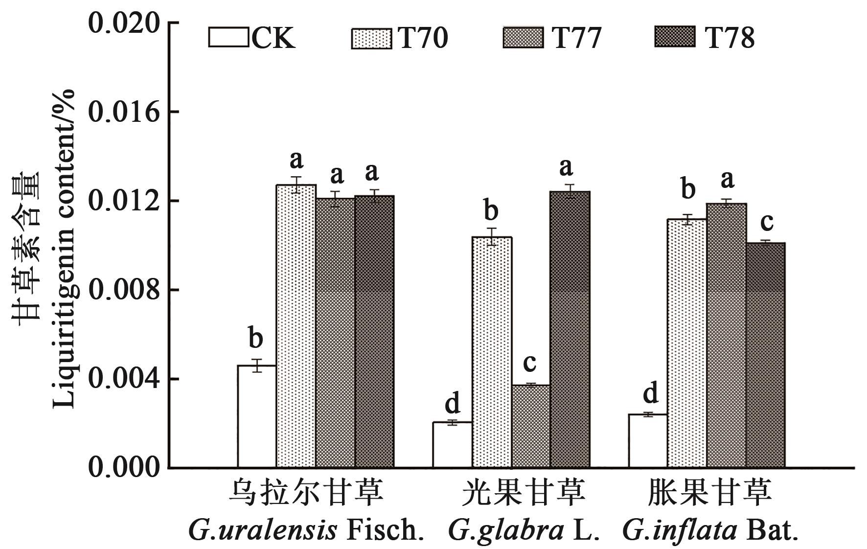图5 不同根瘤菌处理后甘草的甘草素含量注: 不同小写字母表示不同处理间在P<0.05水平差异显著。
