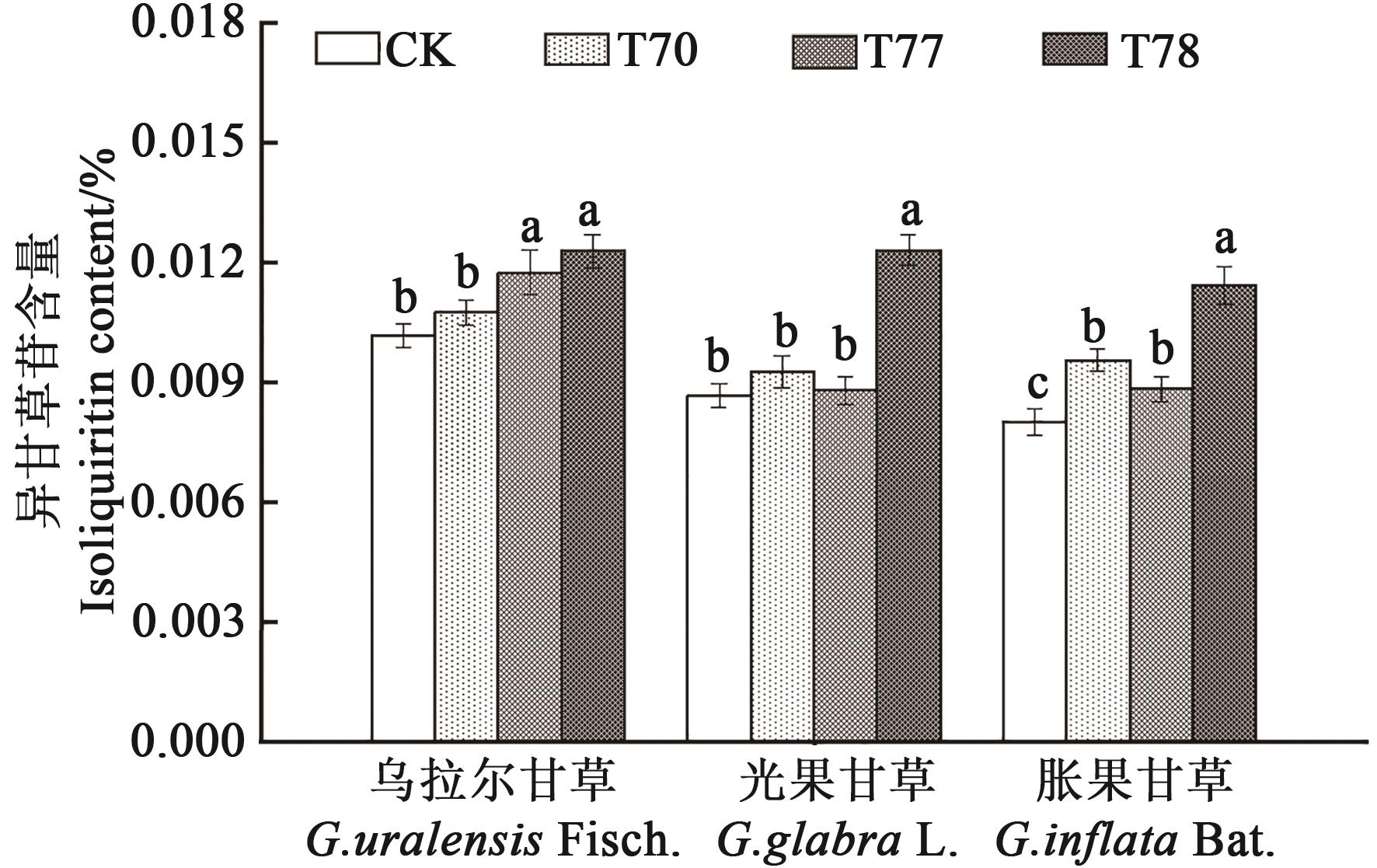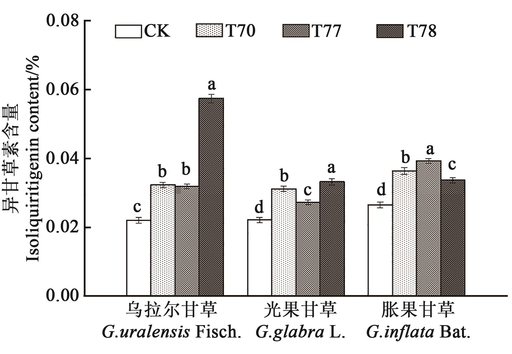 图6 不同根瘤菌处理后甘草的异甘草苷含量注: 不同小写字母表示不同处理间在P<0.05水平差异显著。