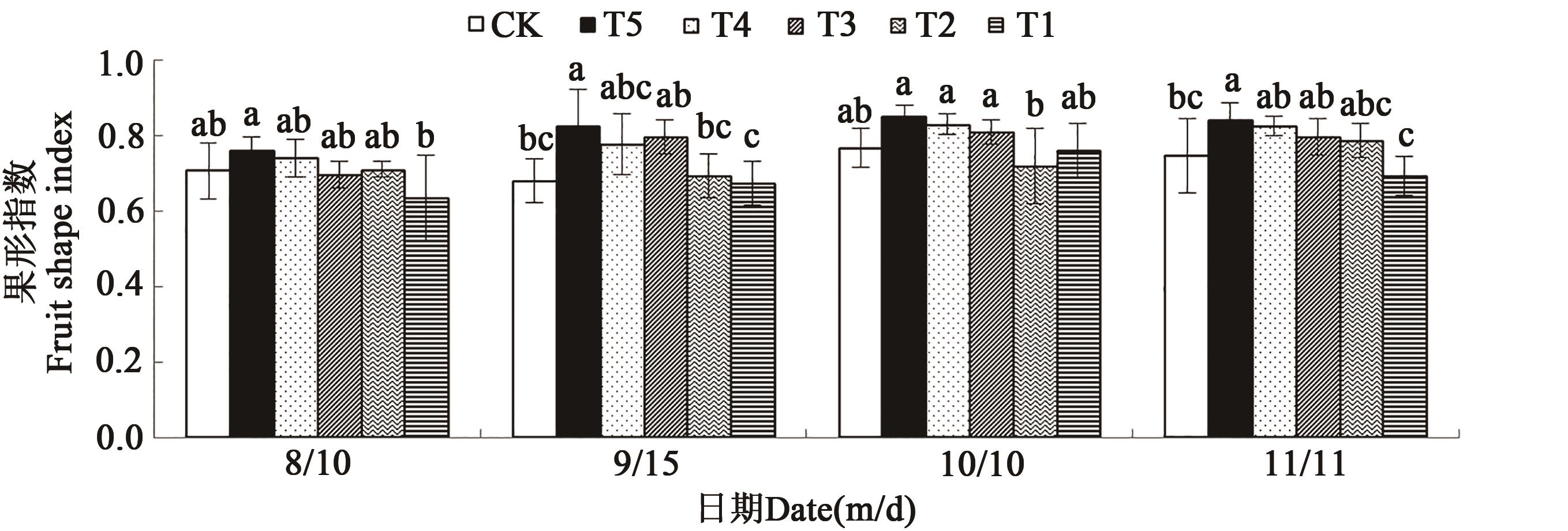 图3 在微生物菌剂下不同时期的果实果形指数注:同一时期中不同小写字母表示不同处理间差异在P<0.05水平显著。