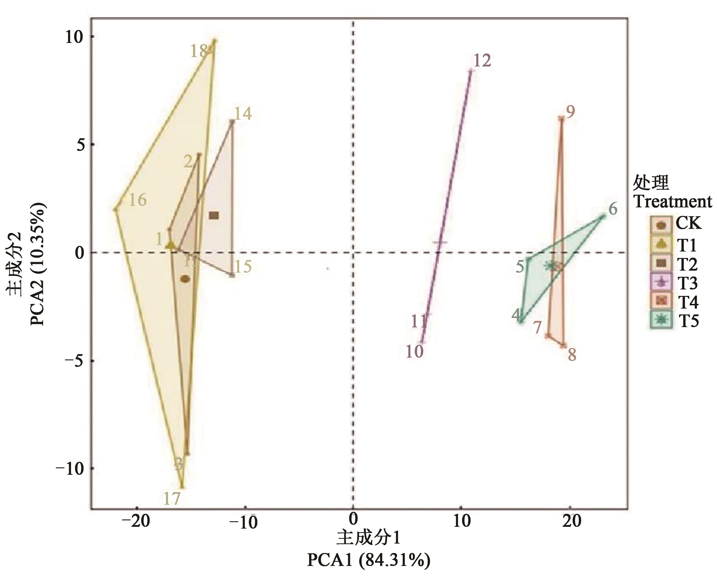 Fig. 8 PCoA analysis Compared to CK of red raspberry traits and soil indicators in different treatments under microbial inoculumNote: 1~3 represent three repeats of CK; 4~6 represent three repeats of T5; and so on, 16~18 represent three repeats of T1.