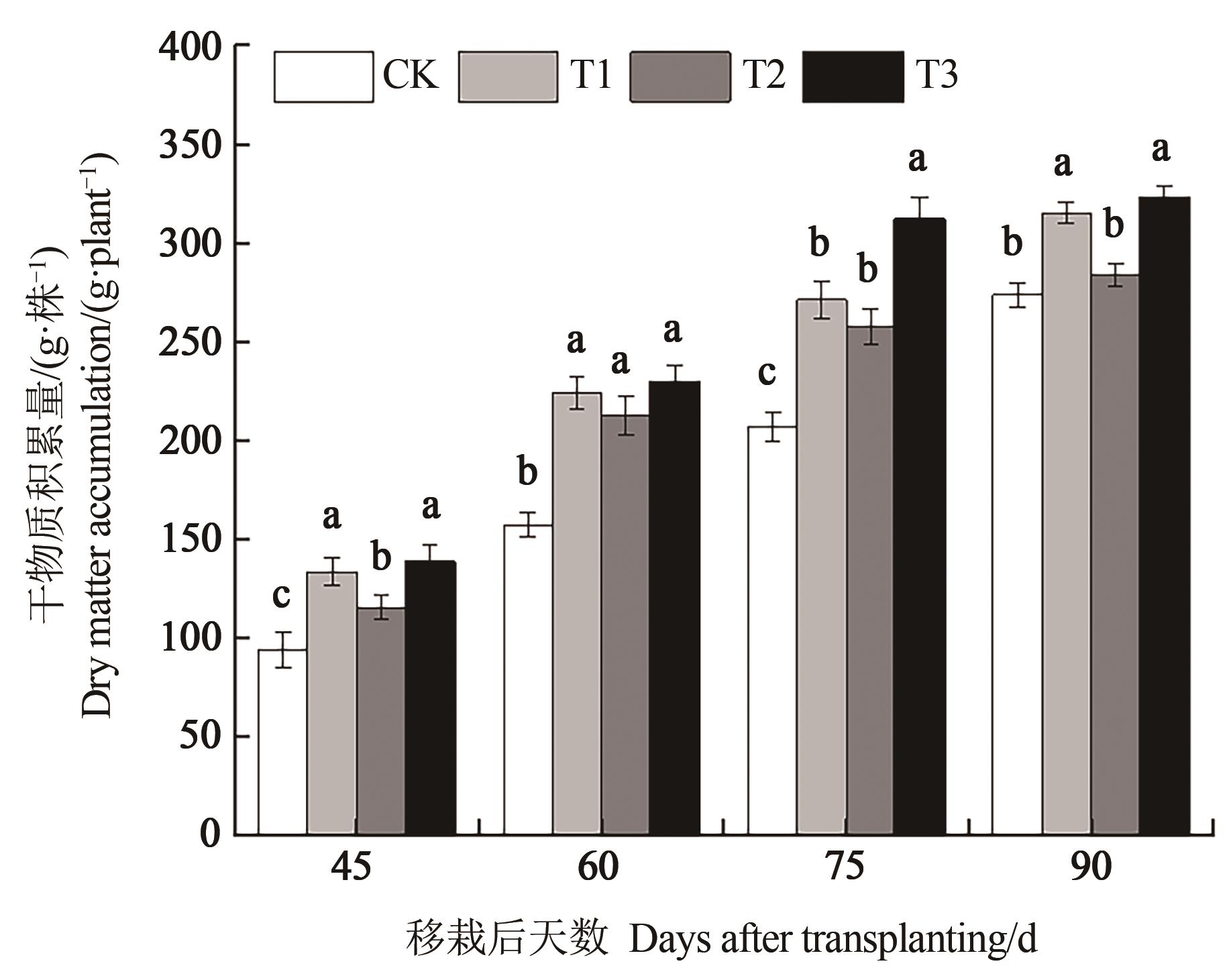 图1 不同处理烤烟生长过程中叶片干物质积累量注:同一时期中不同小写字母表示处理间在P<0.05水平差异显著。