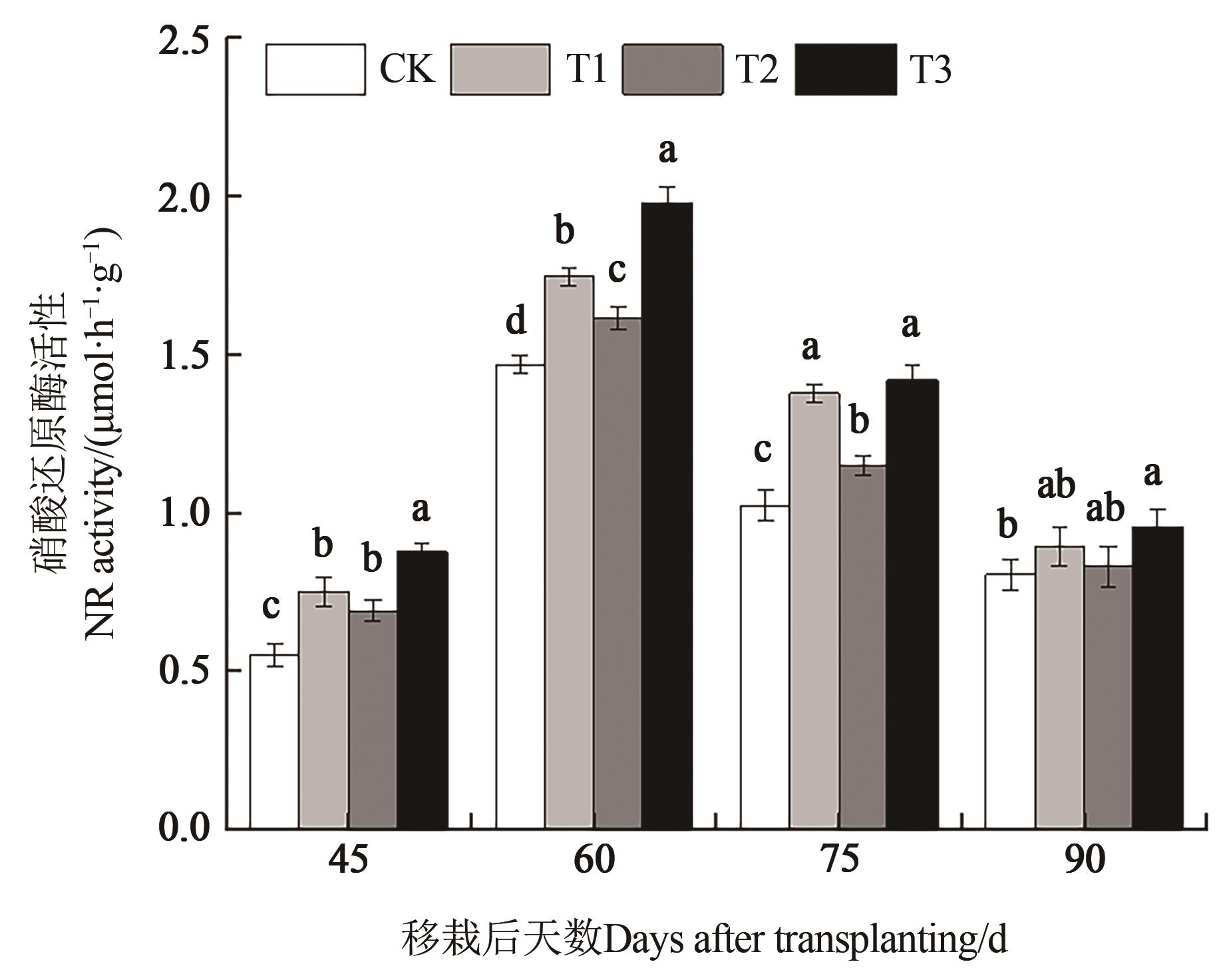 Fig. 2 NR activity in leaves during flue-cured tobacco growth under different treatmentsNote: Different lowercase letters in the same stage indicate significant differences among treatments at P<0.05 level.