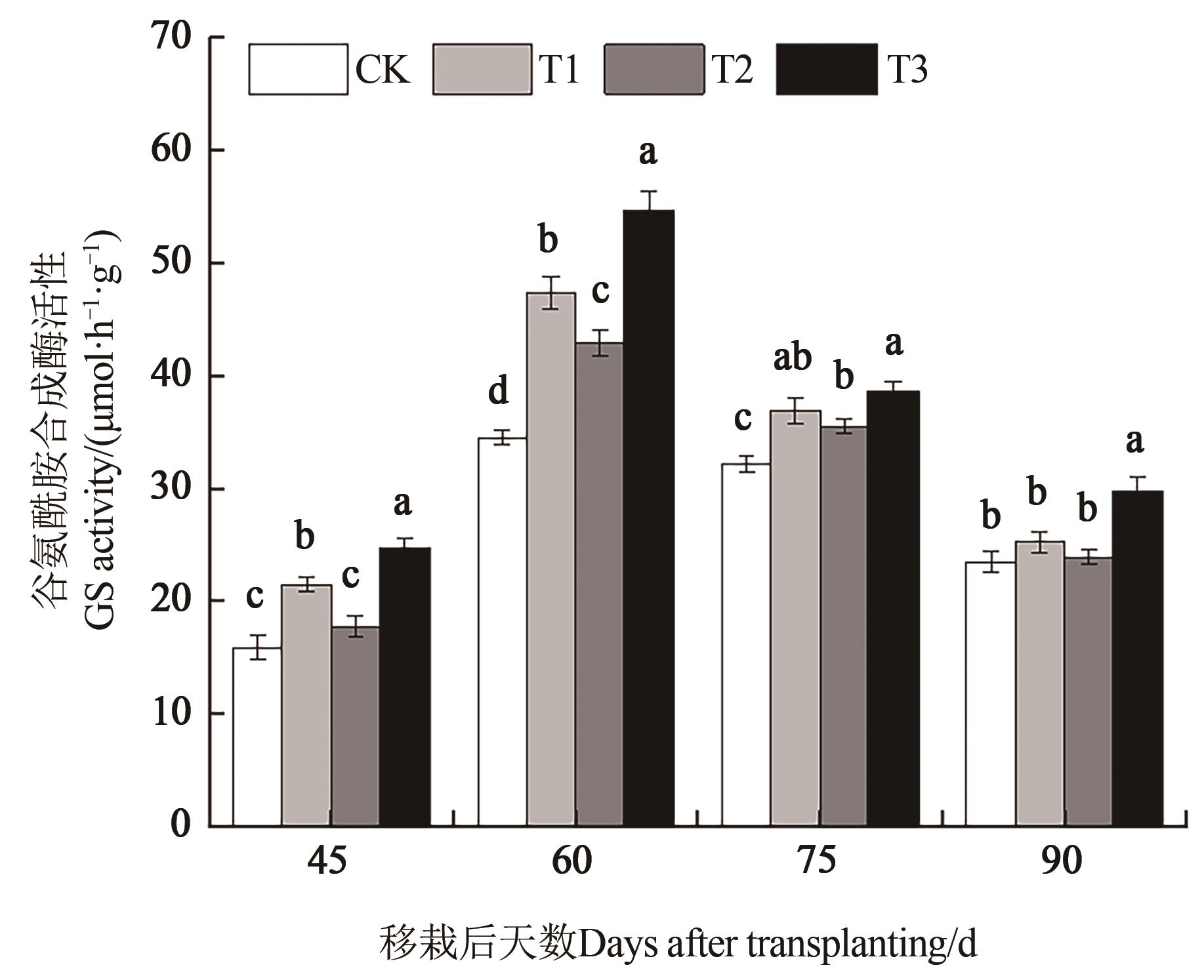 Fig. 3 GS activity in leaves during flue-cured tobacco growth under different treatmentsNote: Different lowercase letters in the same stage indicate significant differences among treatments at P<0.05 level.