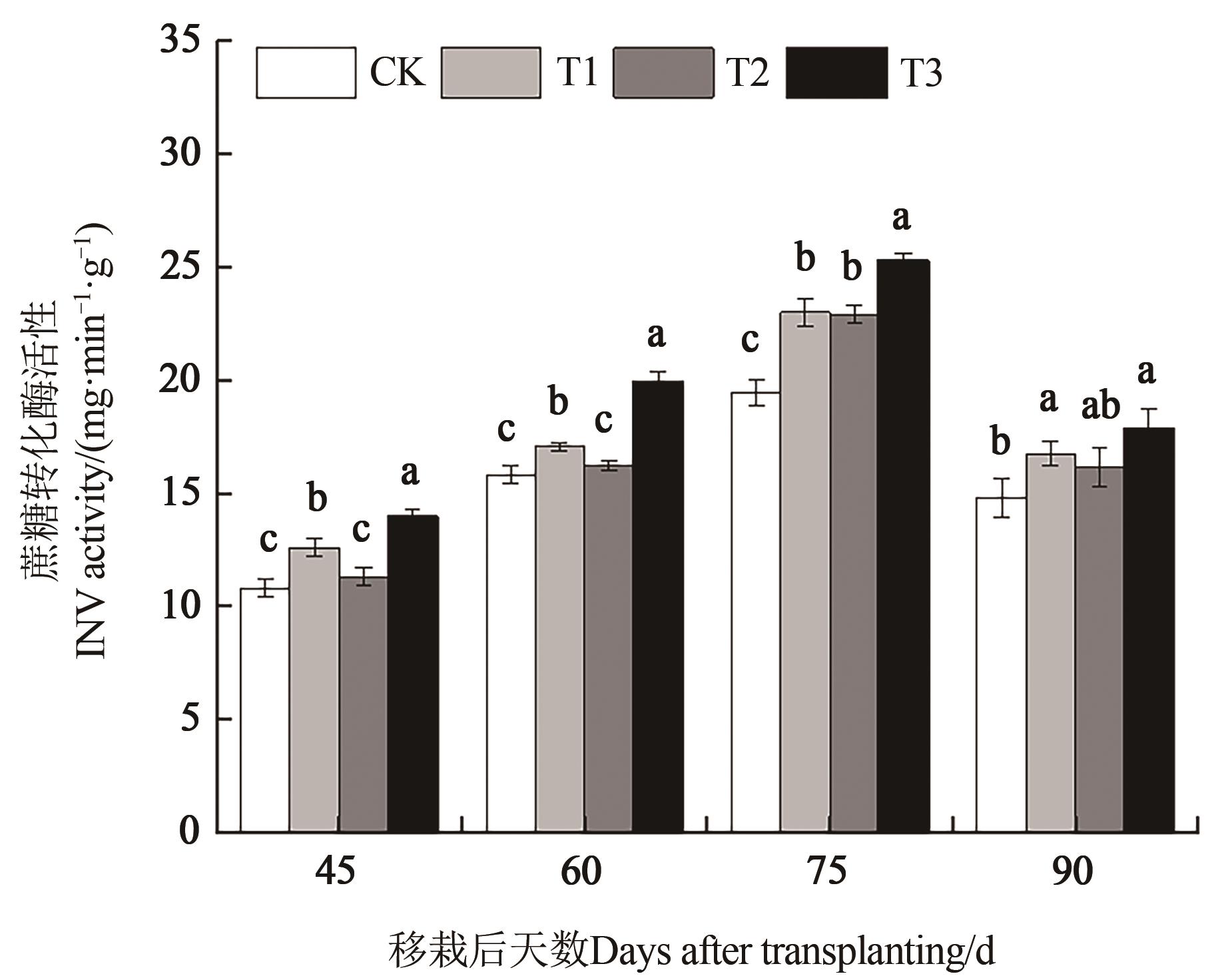 Fig. 4 INV activity in leaves during flue-cured tobacco growth under different treatmentsNote: Different lowercase letters in the same stage indicate significant differences among treatments at P<0.05 level.