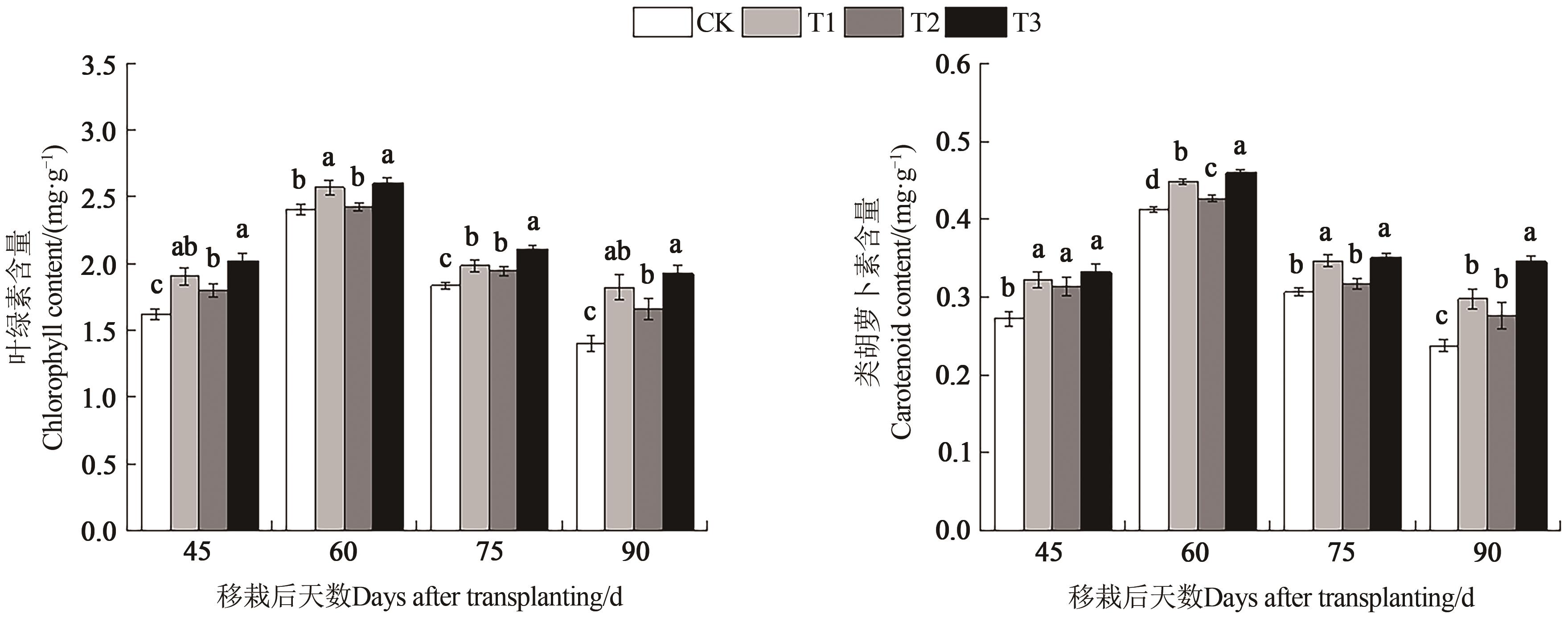 Fig. 5 Plastid pigment content in leaves during flue-cured tobacco growth under different treatmentsNote: Different lowercase letters in the same stage indicate significant differences among treatments at P<0.05 level.