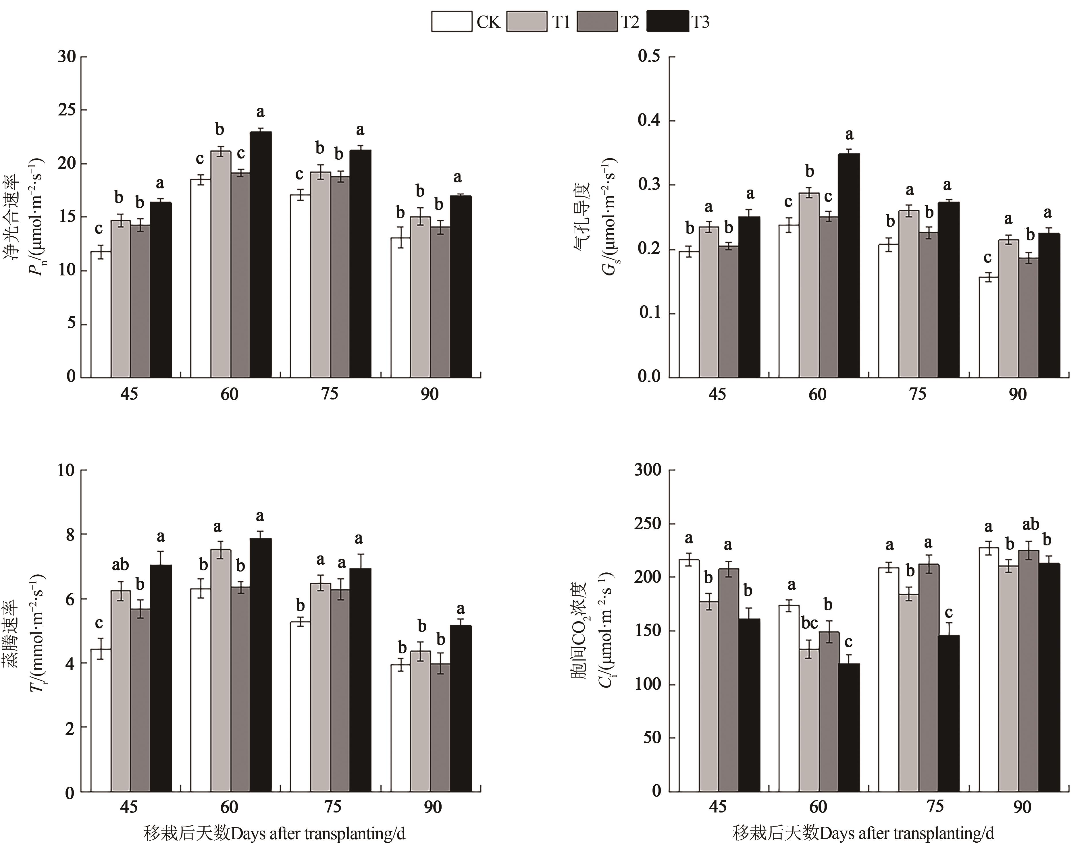 图6 不同处理烤烟生长过程中叶片光合性能注:同一时期中不同小写字母表示处理间在P<0.05水平差异显著。