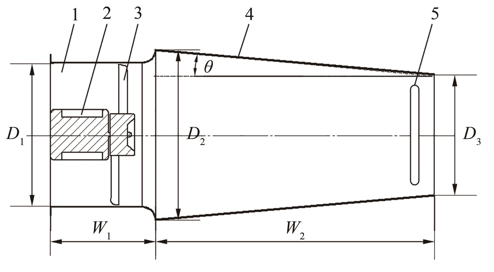 Fig. 1 Air duct cross-sectional structureNote:1—Axial flow fan; 2—Motor; 3—Blade; 4—Ram; 5.—Ring spray device; D1—Fan diameter; D2—Diameter of the air duct inlet end face; D3—End face diameter of air duct outlet; W1—Fan width; W2—Length of air duct; θ—Angle between cylinder wall and axis.