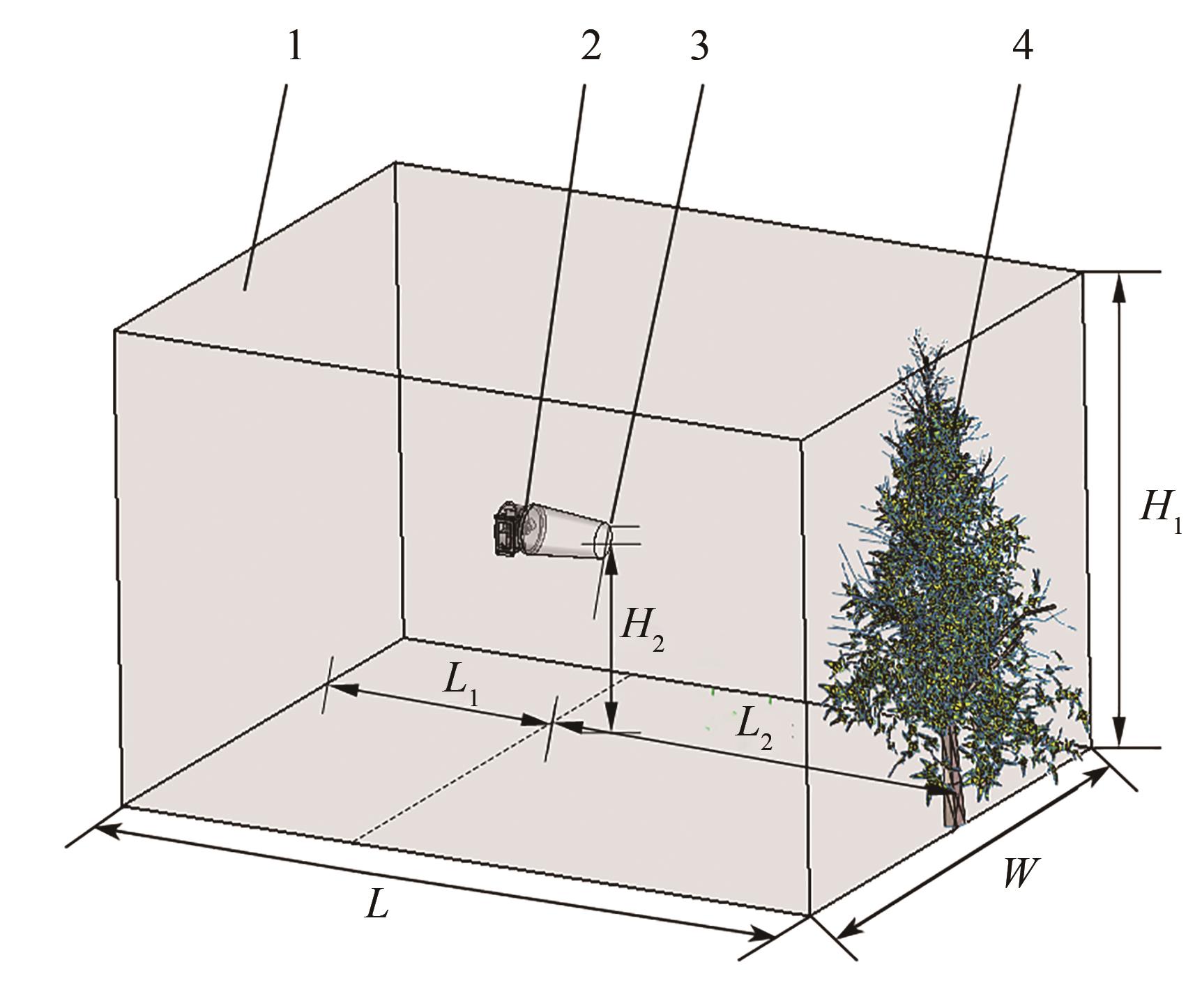 Fig. 2 Three-dimensional model of air ductNote:1—Computing domain; 2—Rotation domain; 3—Ram; 4—Fruit tree model; W—Width of the computational domain; L—Length of the computational domain; H1—Height of computing domain; L1—Distance between the air duct outlet and the left boundary of the computing domain; L2—Distance between the outlet of air duct and the fruit tree; H2—Distance between the fan axis and the ground of the computing domain.