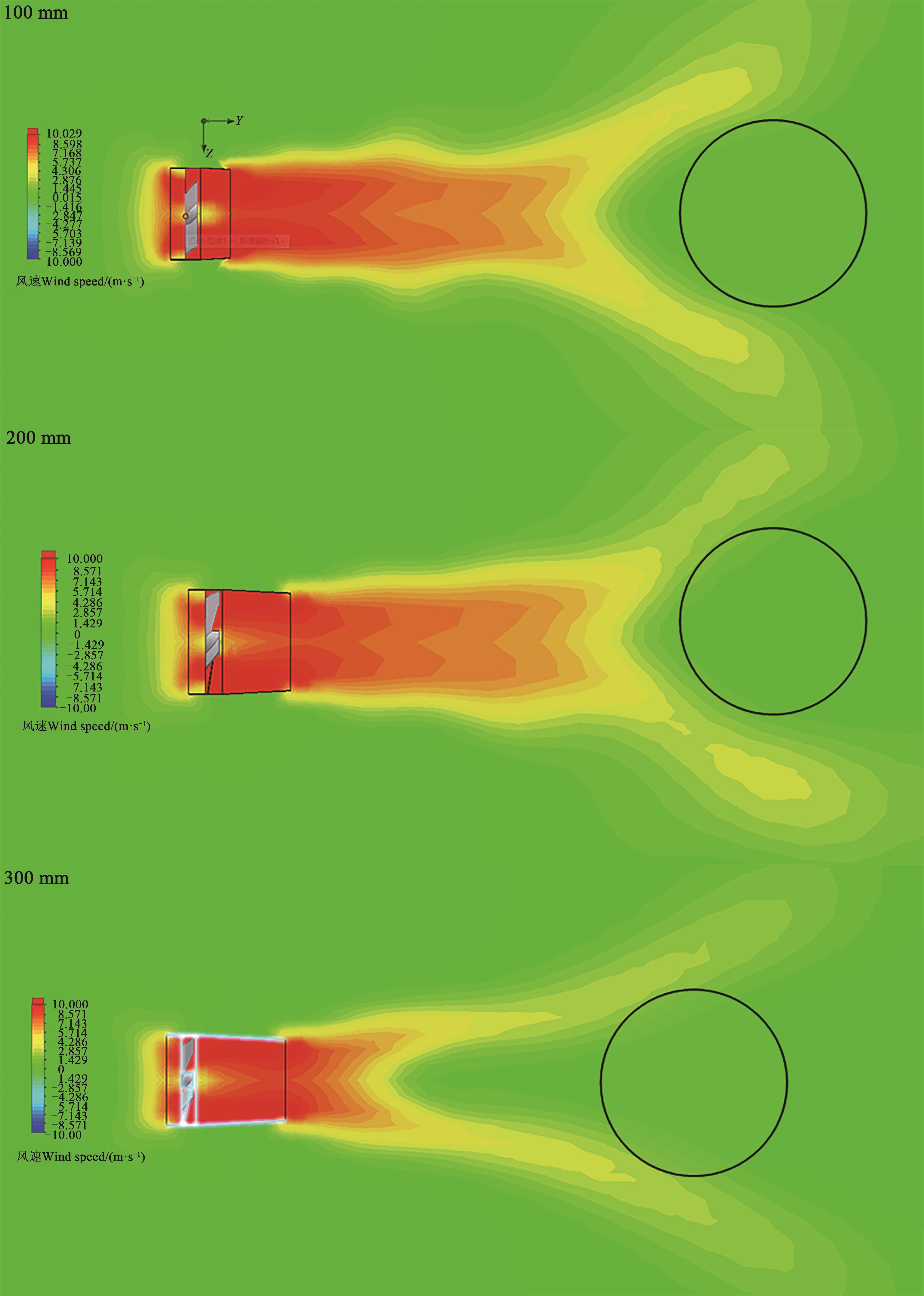 Fig. 8 Section cloud images of wind speed with duct lengths of 100, 200 and 300 mmNote:The darker the color, the higher the wind speed, and the circular box area is the area where the airflow is not disturbed.
