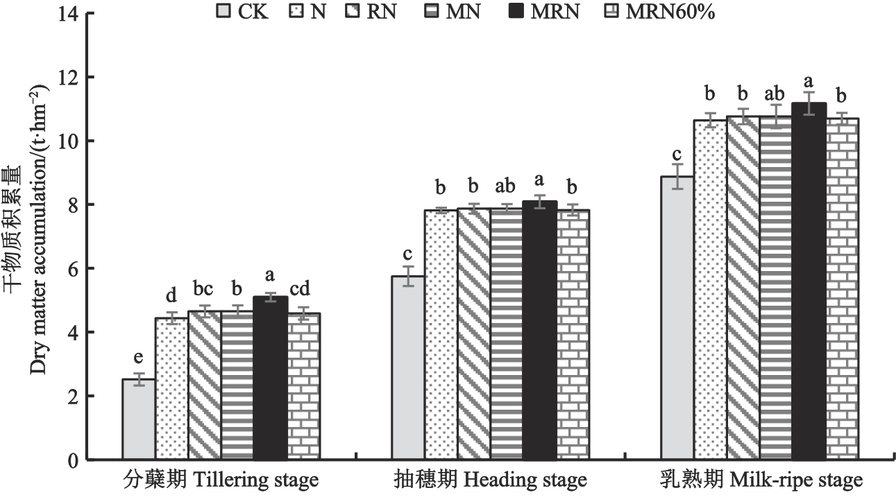 Fig. 1 Dry matter accumulation of rice under different fertilization treatmentsNote: Different lowercase letters indicate significant differences between different treatments in same stage at P<0.05 level.