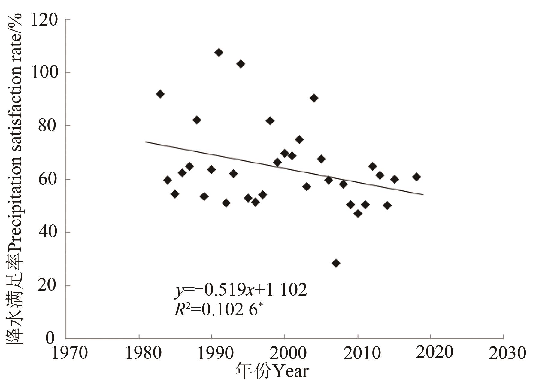 Fig. 4 Precipitation satisfaction rate during growth period of winter wheat from 1981 to 2019Note: * indicates significant correlation at P<0.05 level.