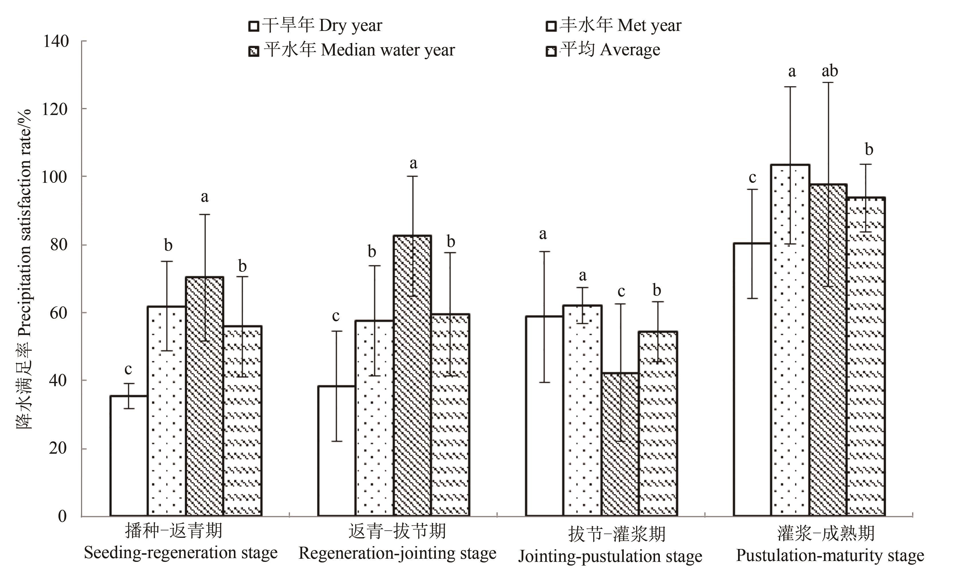 Fig. 5 Precipitation satisfaction rate in winter wheat of different growth periodNote: Different lowercase letters indicate significant differences between different treatments at P<0.05 level.