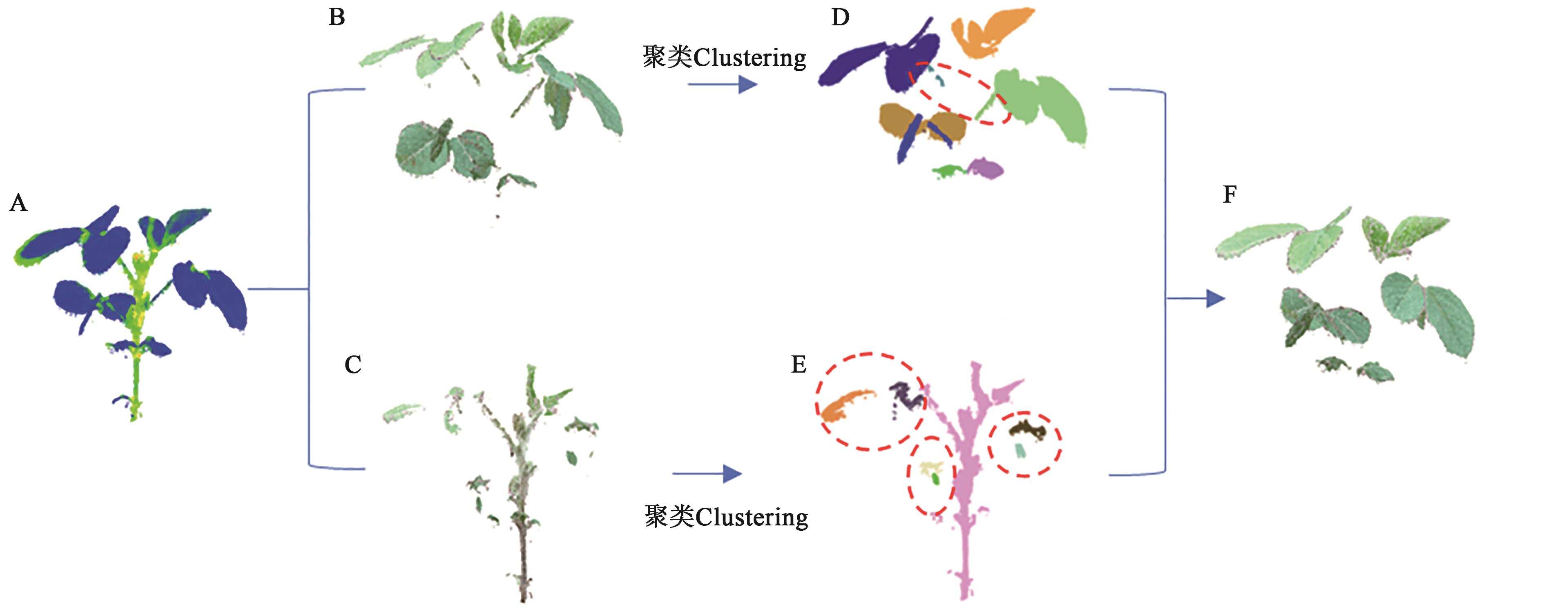 Fig. 4 Stem and leaf segmentation of soybean plantA: Initial point clouds; B: Preliminary canopy point clouds;C: Preliminary stem point clouds; D: Filter the stem point clouds; E: Backfill canopy point clouds; F:Full canopy point clouds