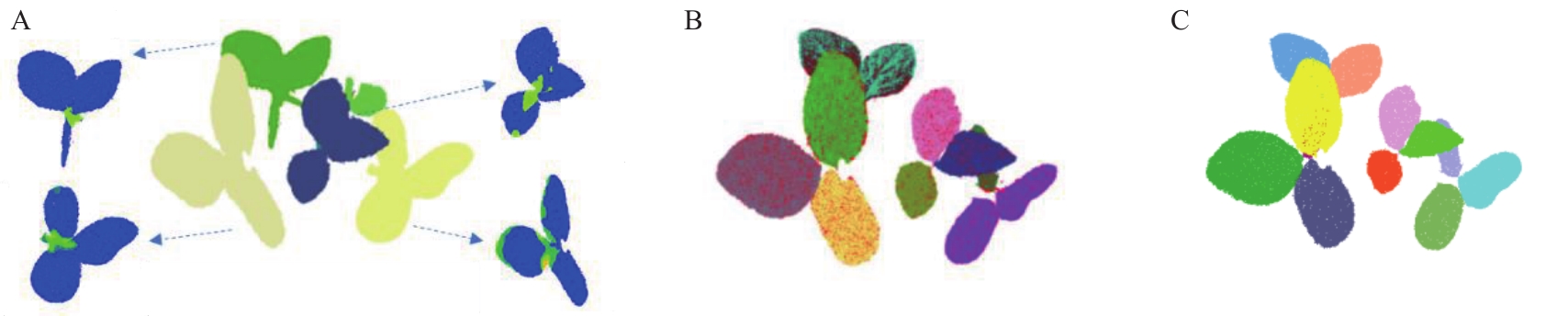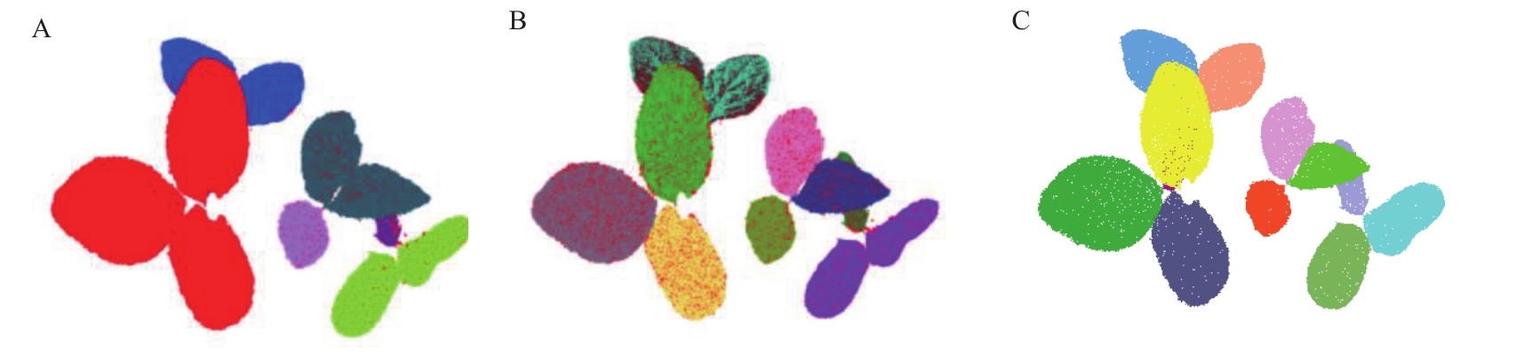 Fig. 8 Results of leaf segmentation under different parametersA:Region growth segmentation;B:Region growth segmentation with small parameters;C:Improved region growth segmentation with small parameters