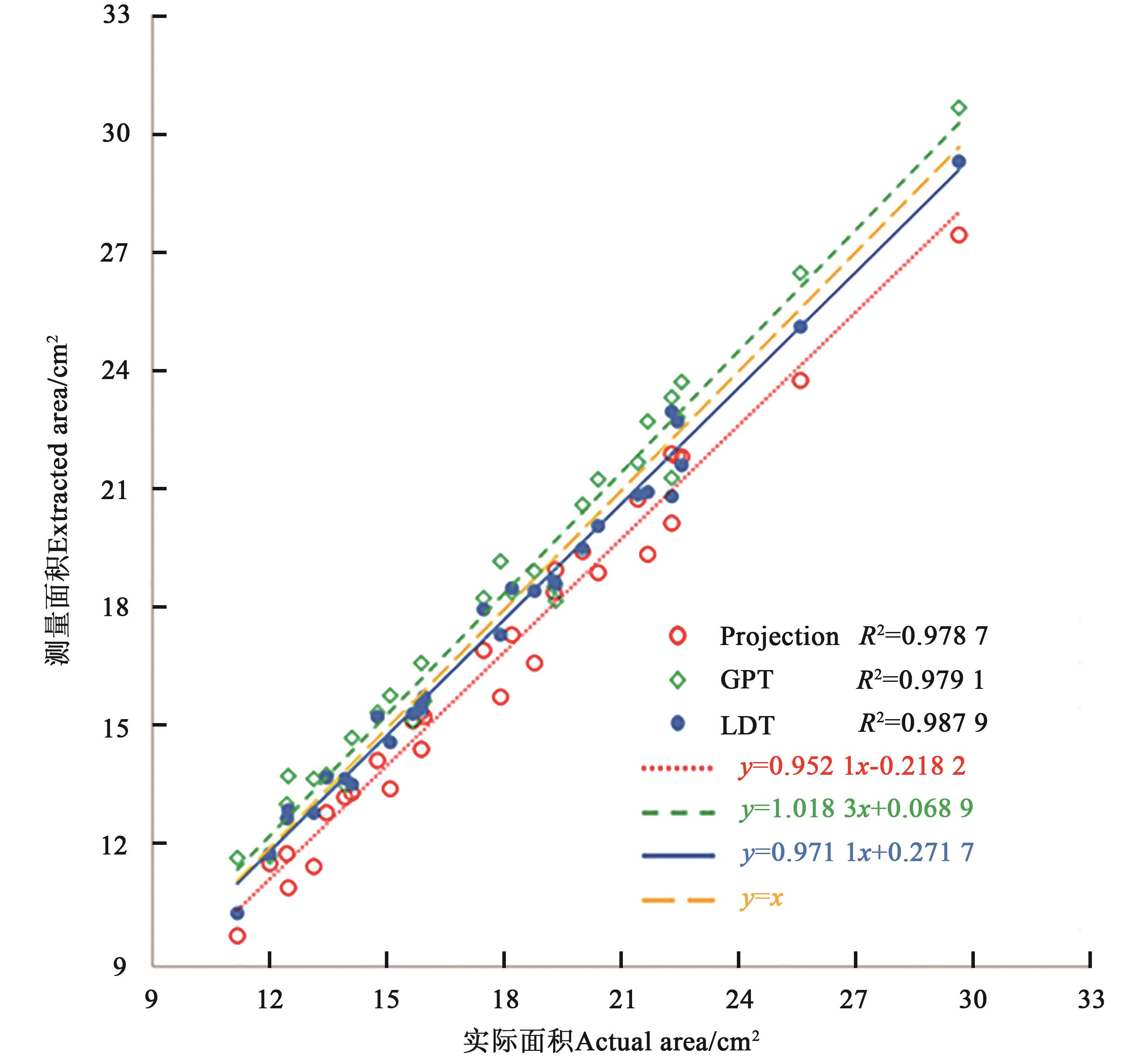 测量方法 Measurement methods | 平均相对误差 MRE/% | 决定系数 R2 | 均方根误差 RMSE/cm2 |